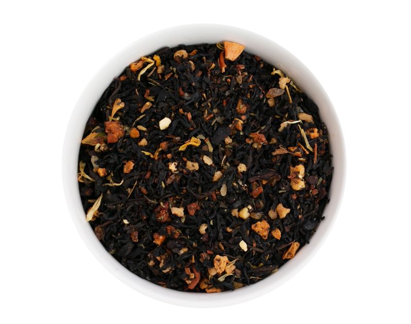Согревающий купаж черного чая с засахаренными кусочками фруктов, жареным цикорием, фундуком, каштаном и цветами. Помогает укрепить иммунитет.