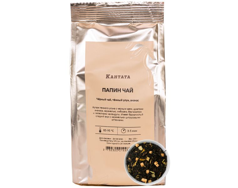 Состав: чёрный чай, ароматизатор, ананас, карамель, улун сильной ферментации, имбирь, лепестки календулы.