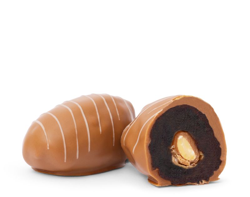 Внутри каждого финика скрывается отборный миндаль, который покрывается карамельным шоколадом в специальной дражировочной машине. Пикантный орех не только усиливает вкусовые ощущения, но и добавляет десерту хрустящую текстуру. Миндаль богат полезными жирами, белками и витаминами, что делает его отличным дополнением сочного финика.