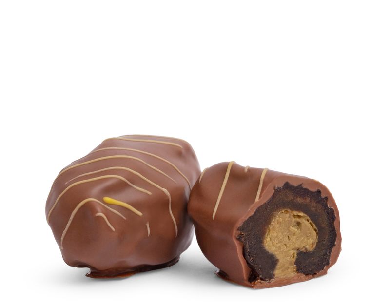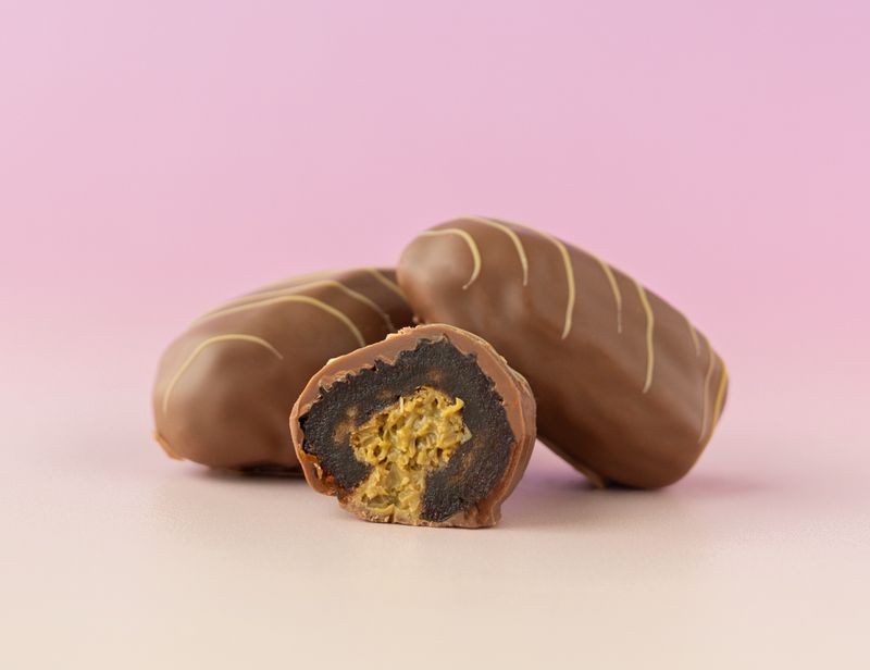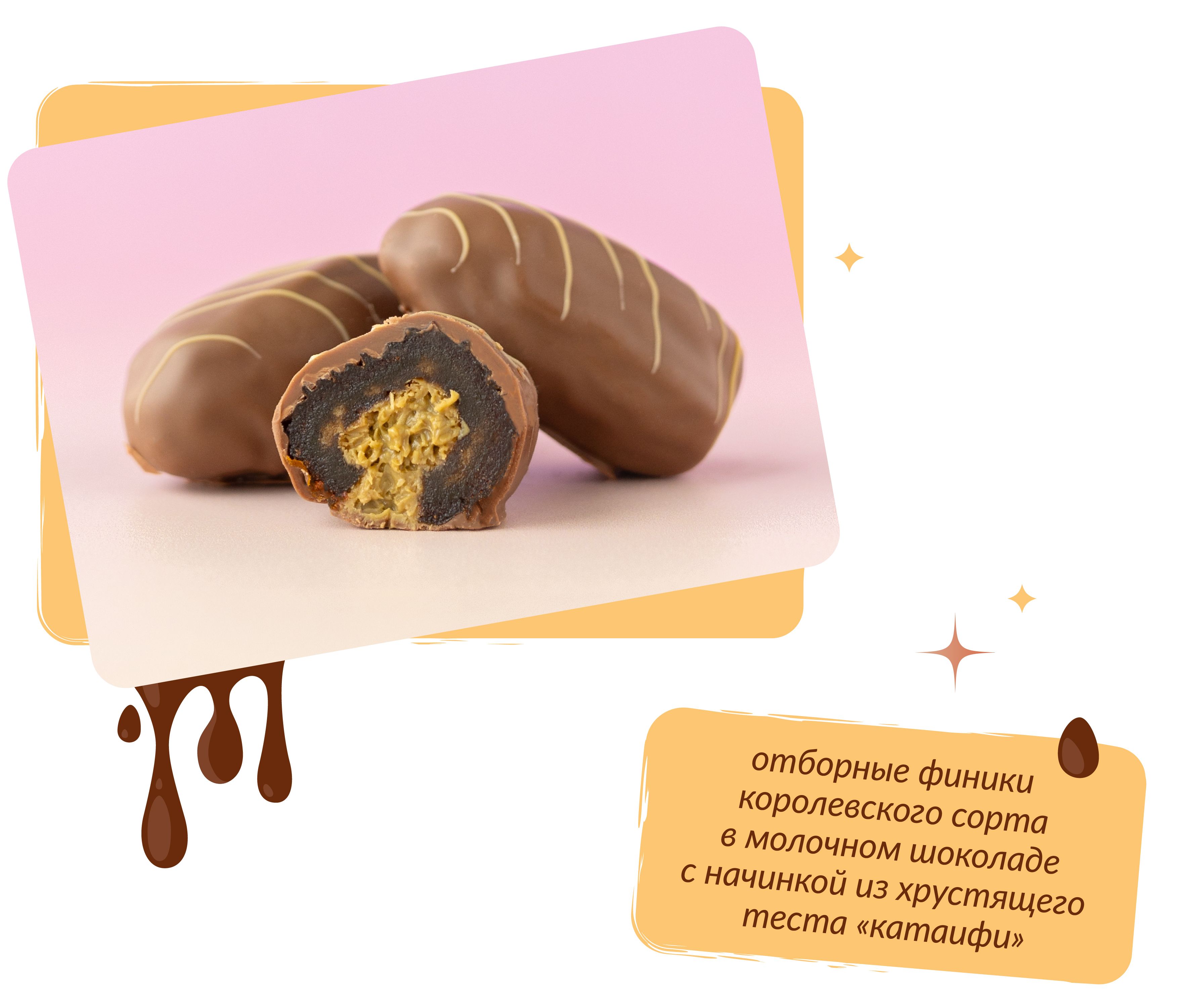 Каждый финик глазируется собственным купажом молочного шоколада. Благодаря своему натуральному составу шоколад имеет насыщенный вкус и глубокий аромат какао. Но главная изюминка этого лакомства — хрустящая начинка, созданная из тонкого восточного теста «катаифи», нежной фисташковой пасты и пасты из кешью собственного производства. Благодаря добавлению в начинку белого шоколада, вкус десерта мягкий и сбалансированный.