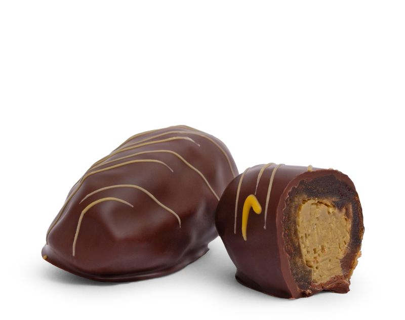 Внутри каждого финика прячется хрустящая ореховая начинка, созданная из тонкого восточного теста «катаифи», фисташковой пасты и пасты из кешью собственного производства. Кремовая текстура ореховых паст идеально гармонирует с другими ингредиентами, а белый шоколад, добавленный в начинку, смягчает общий вкус, придавая десерту особую изысканность.