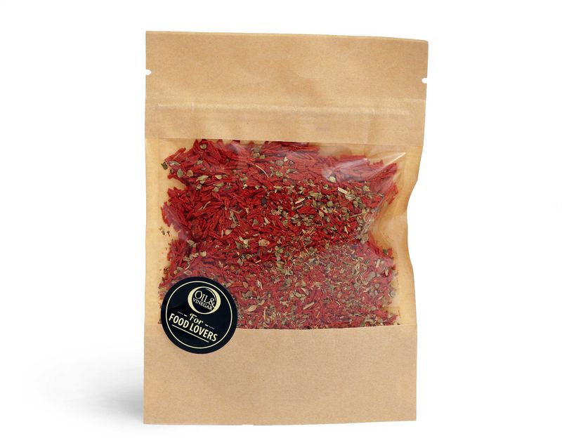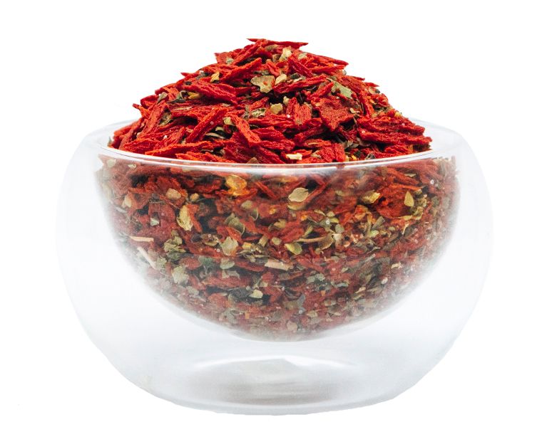 Состав: томатные хлопья (70%) (концентрат томатной пасты, кукурузный крахмал), травы и специи (перец, базилик, паприка, орегано), соль.
