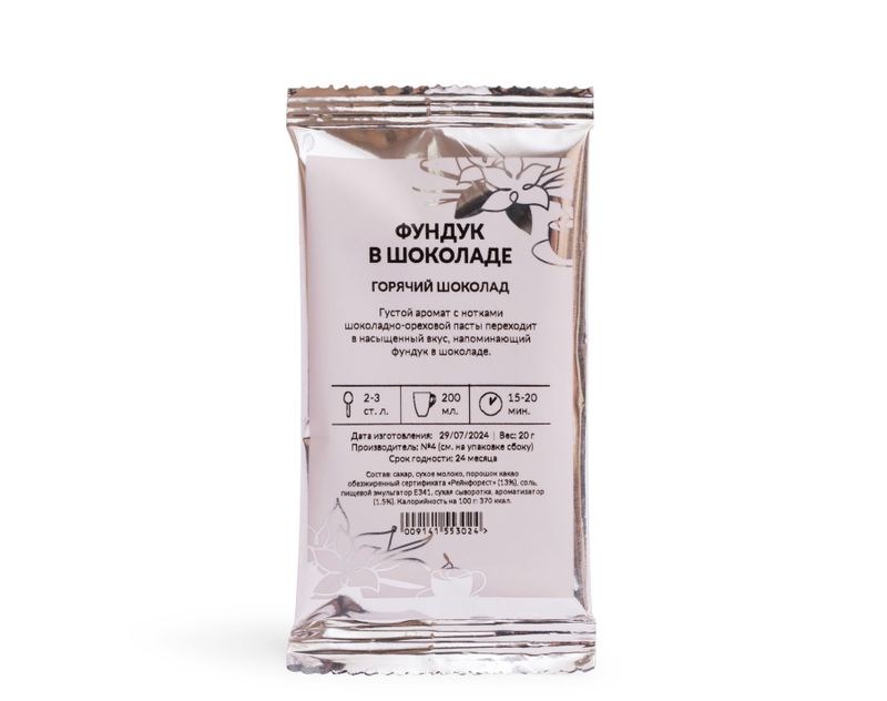 Состав: сахар, сухое молоко, порошок какао обезжиренный сертификата «Рейнфорест» (13%), соль, пищевой эмульгатор Е341, сухая сыворотка, ароматизатор (1,5%).
