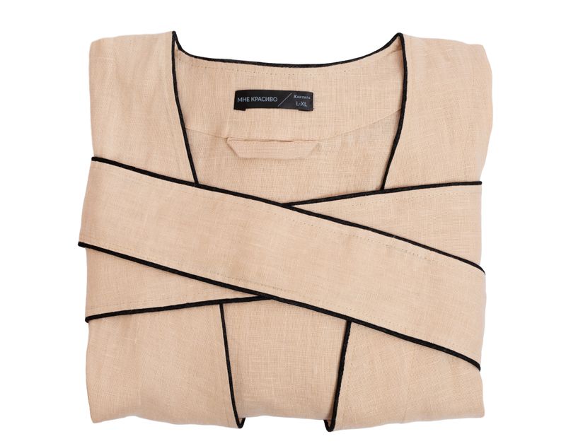 Халат выполнен из льна высокого качества без добавления синтетических материалов, он имеет широкие рукава-кимоно и элегантный пояс. Фасон халата универсален, он выполнен с учетом всех типов фигур и особенностей.
