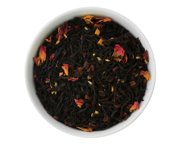 Купаж черного чая, кусочков какао, кокосовой стружки и лепестков розы.