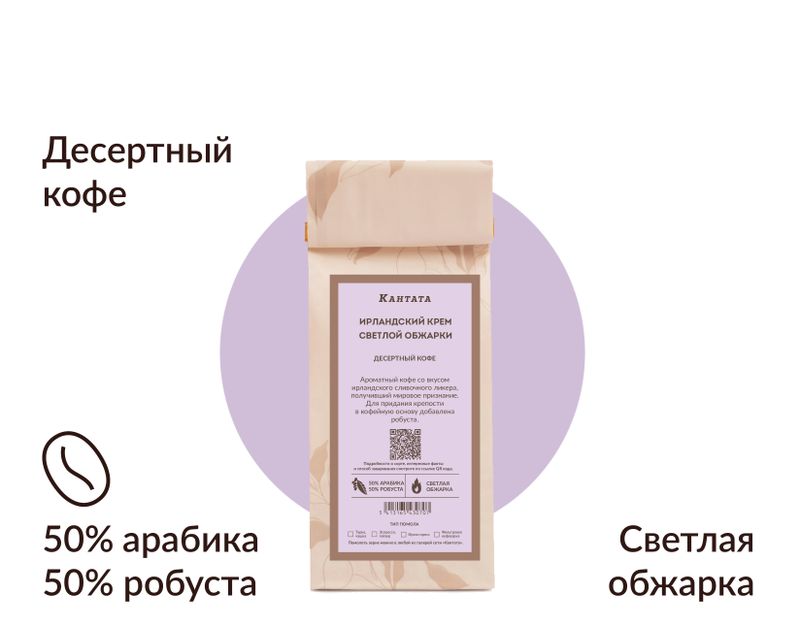 Напиток раскрывается сливочной нежностью и густой сладостью, за которыми чувствуется приятная алкогольная терпкость. Это сочетание вкусов так любимо нашими гостями, что в ассортименте Кантаты представлено в 5 вариантах (растворимый, капсулы, зерно, зерно декаф, зерно светлой обжарки).