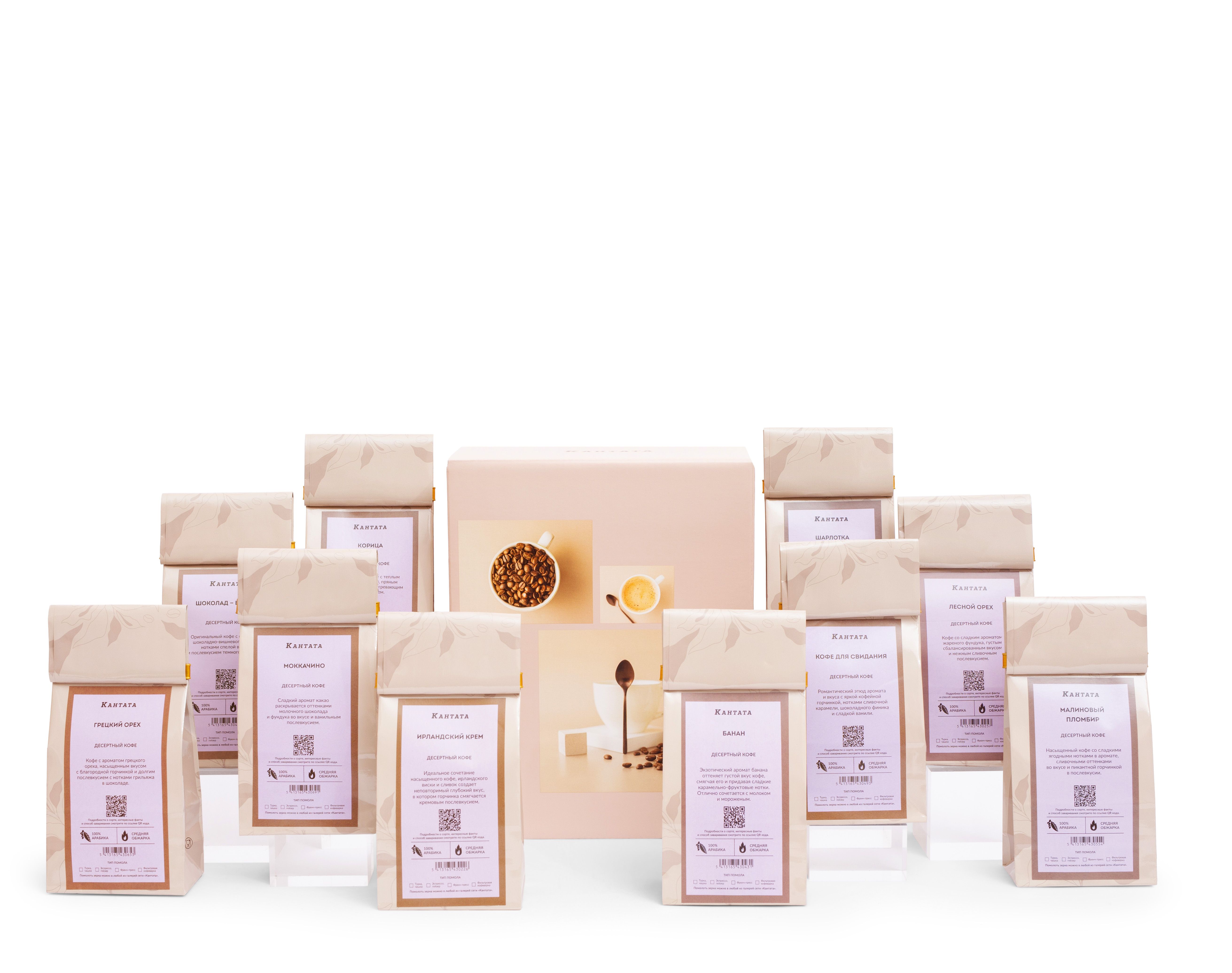 Коллекция десертных сортов порадует кофемана. Сливочные, ореховые, фруктовые, пряные, ягодные. Для любого настроения и повода. Каждый сорт представлен в объеме 40 грамм.