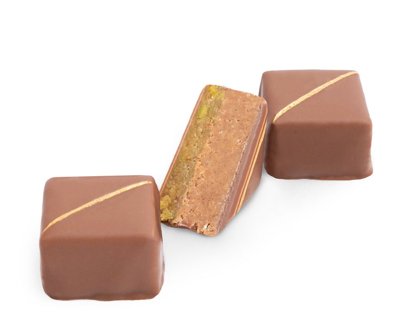 Мягкое ореховое пралине из миндаля и фисташки, в нежном молочном шоколаде. Подарит удовольствие сладкоежкам любого возраста.