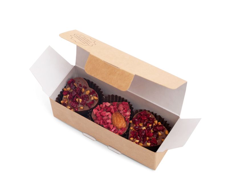 Два «сердца» — два разных вкуса: молочный шоколад с малиной, миндалем и хрустящей вафельной крошкой, а также молочный шоколад с карамелизированным фундуком, кокосом и вишней. Вес 1 шт: 15г.