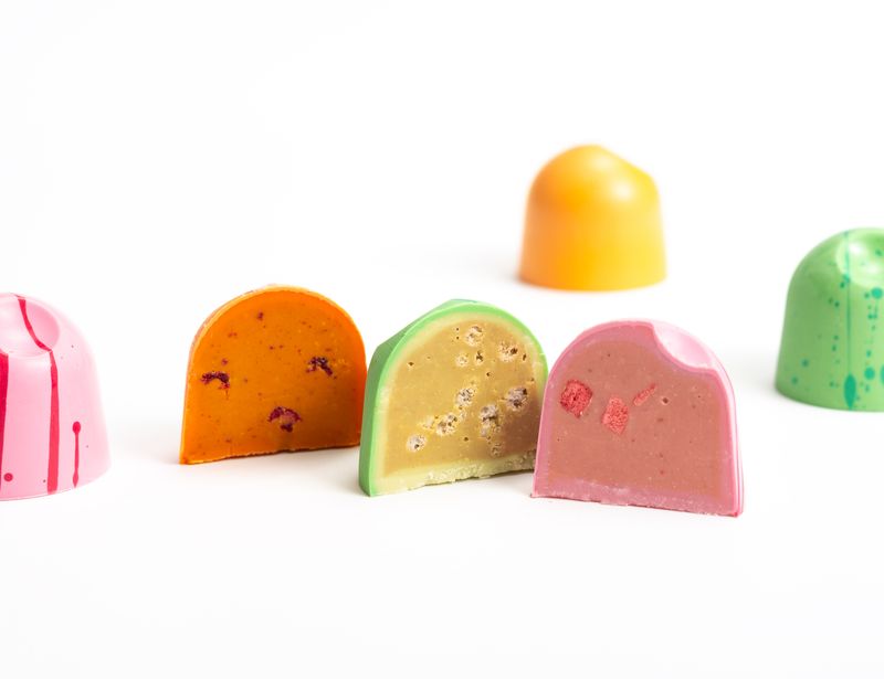 Зеленая конфета содержит в своем составе шоколадно-фисташковую начинку с шариками воздушного риса и церемониальным японским зеленым чаем «Матча».