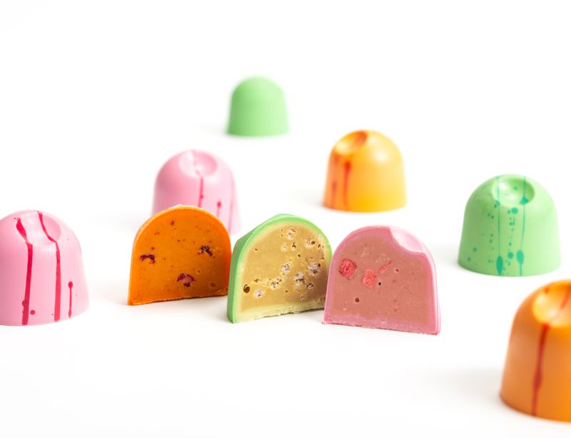 Зеленая конфета содержит в своем составе шоколадно-фисташковую начинку с шариками воздушного риса и церемониальным японским зеленым чаем «Матча».