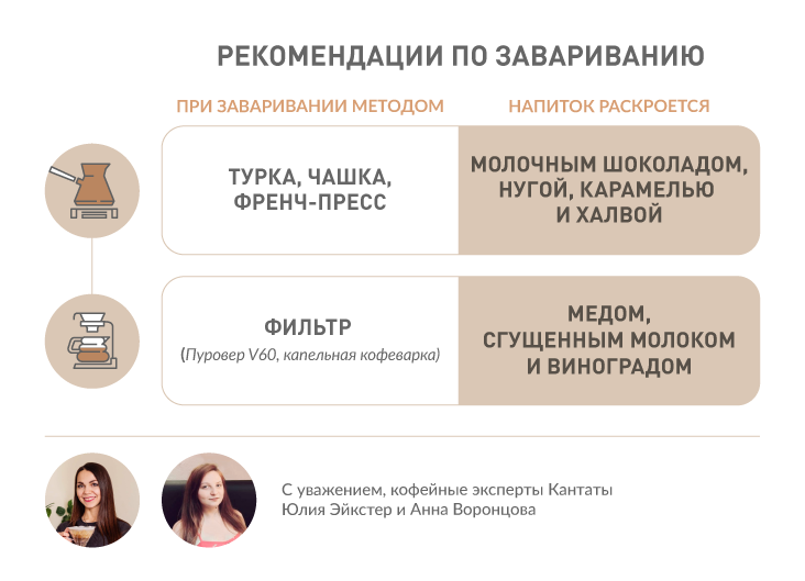 Этот сорт лучше всего раскроется, если его приготовить в: гейзере, турке, чашке, френч-прессе, пуровере V60.