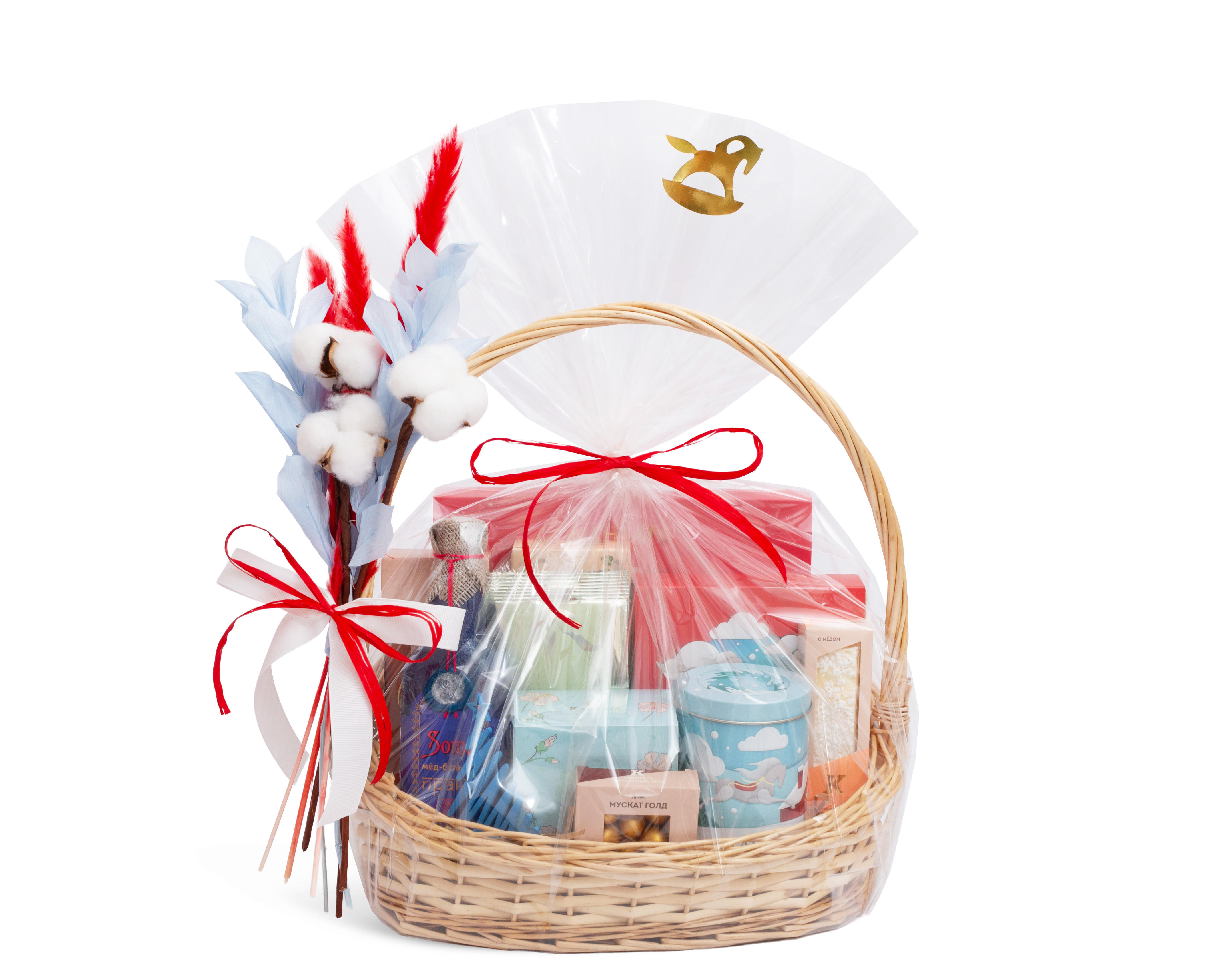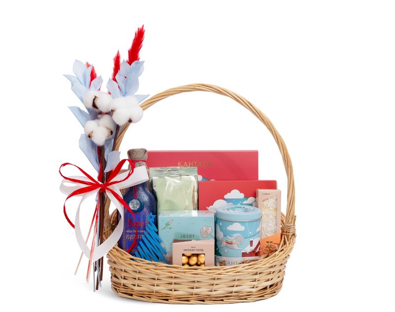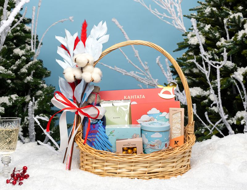 Изысканная корзина с утонченным зимним настроением. Внутри — ароматный чай, пряный сироп и наборы десертов, создающие уют и тепло. Банка «Морозко» подчеркивает атмосферу праздника, а декоративные элементы — ветви, хлопок и голубой рускус — добавляют легкости и свежести. Это подарок, в котором каждая деталь звучит, как мелодия зимнего утра.