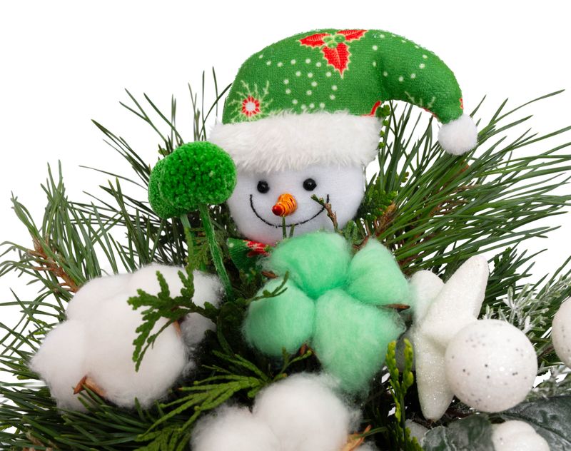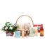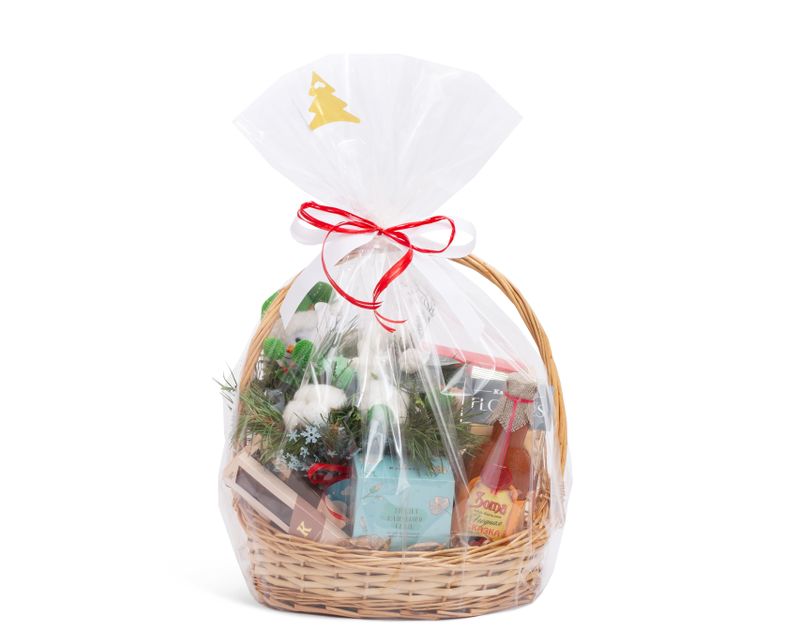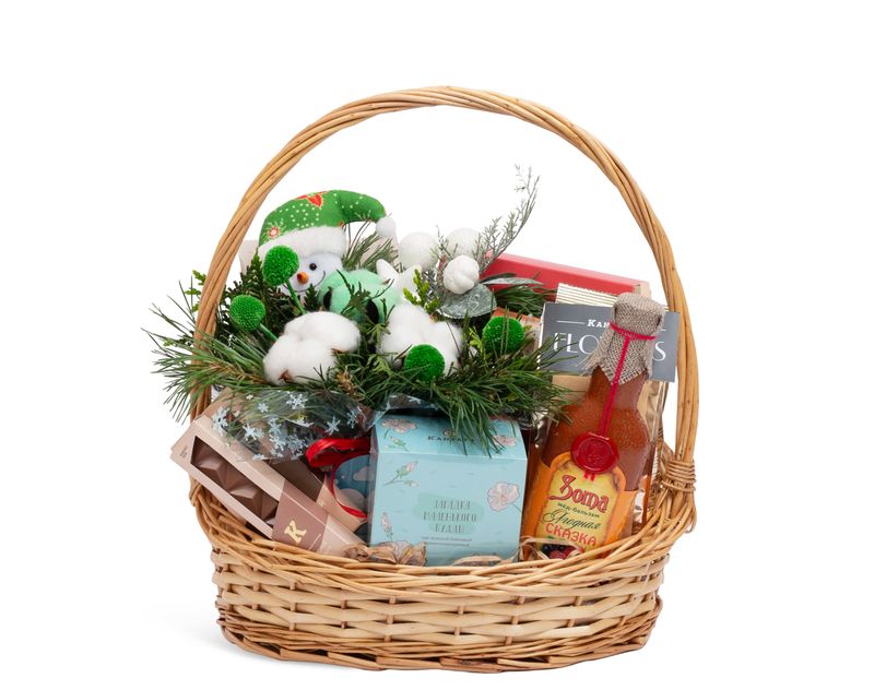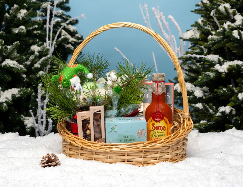 Эффектный подарок в большой плетеной корзине с высоким бортом, оформленный живыми ветвями ели и туи, хлопком и зимними декоративными элементами.