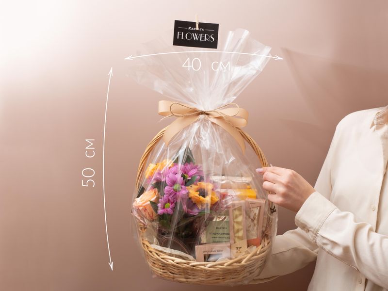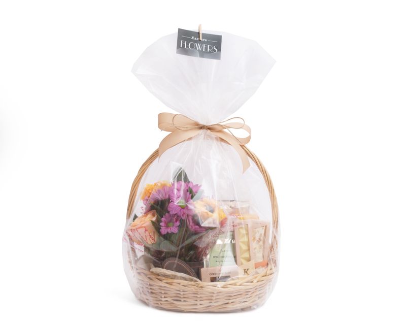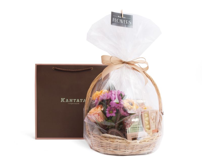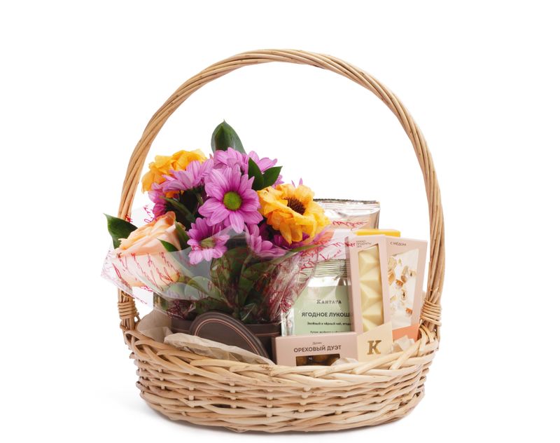 Роскошная корзина, которая без слов поможет выразить признательность! Ее украшением стали живые цветы — роза и хризантема, объединенные в композицию с листочками рускуса. Рядом — восемь душистых сортов чая, классики и купажей на любой вкус: травянистых, сливочных, фруктовых и не только. Чтобы сделать чаепития еще интереснее, в подарок мы добавили медовую нугу, плитку воздушного белого шоколада и золотистые драже с орехами.