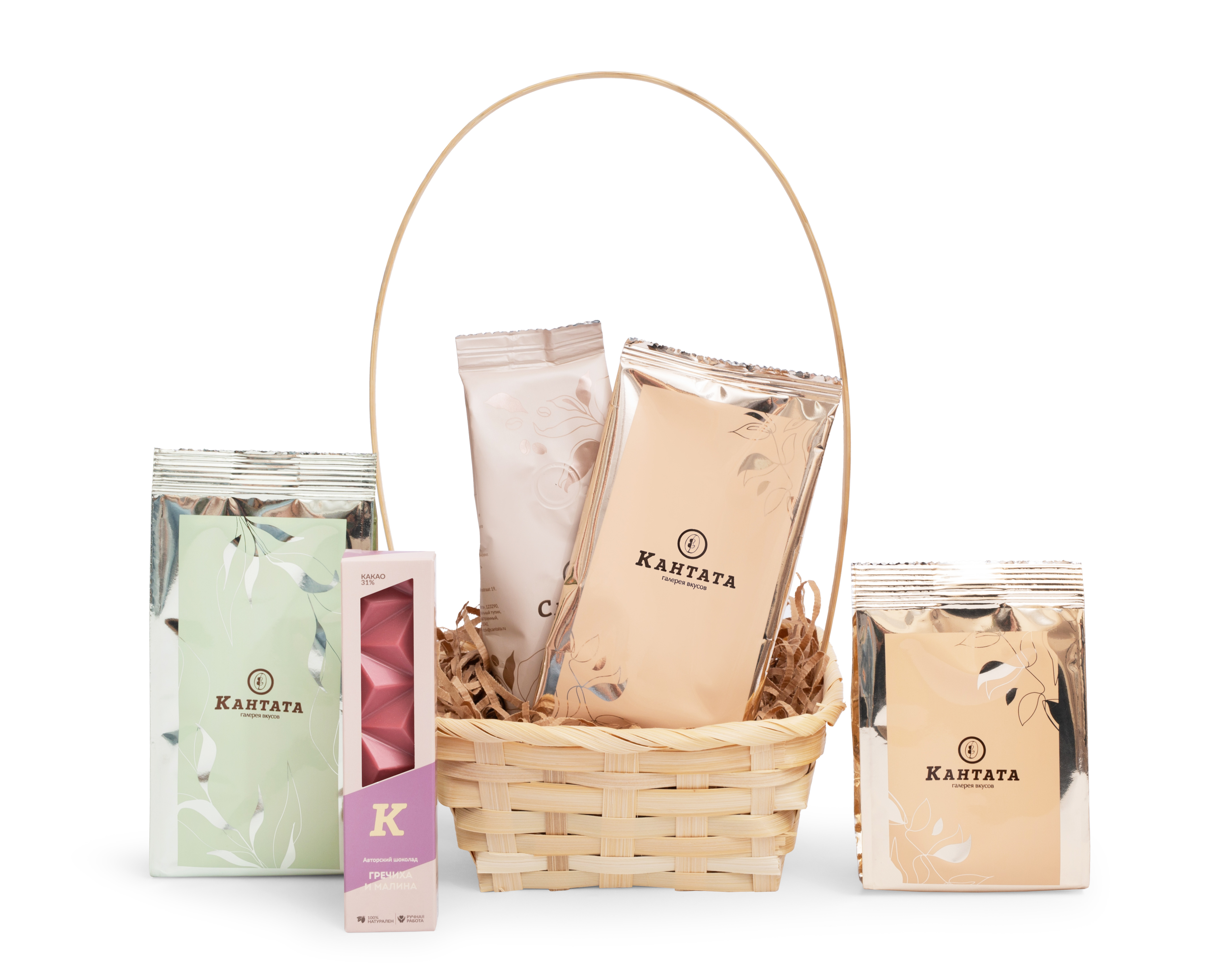 Изысканный набор в плетёной корзине для тех, кто ценит вкусные детали. Внутри — благородный чёрный чай, шоколад с гречихой и малиной, а также десертный кофе. Сдержанная эстетика и продуманное наполнение превращают подарок в настоящий гастрономический жест.