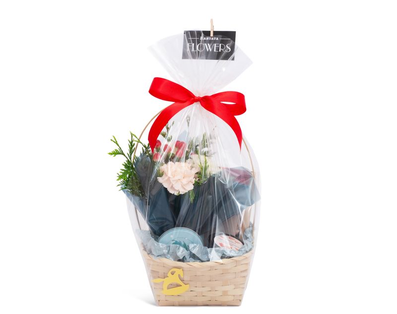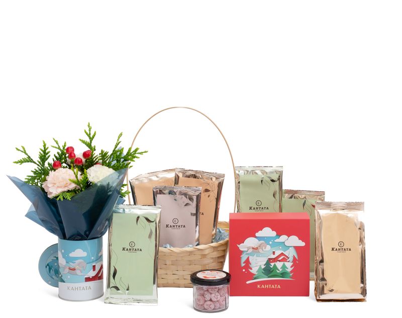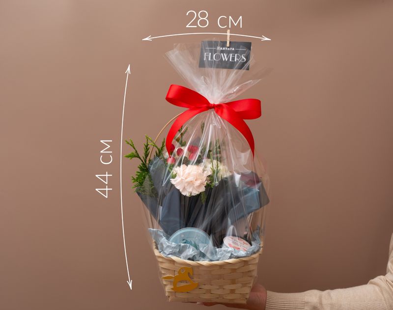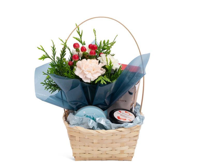 Большая бамбуковая корзина с богатым наполнением для особого случая. Внутри — чайная коллекция, сладости и элементы живой флористики. Продуманное сочетание текстур и оттенков делает подарок эффектным и праздничным.