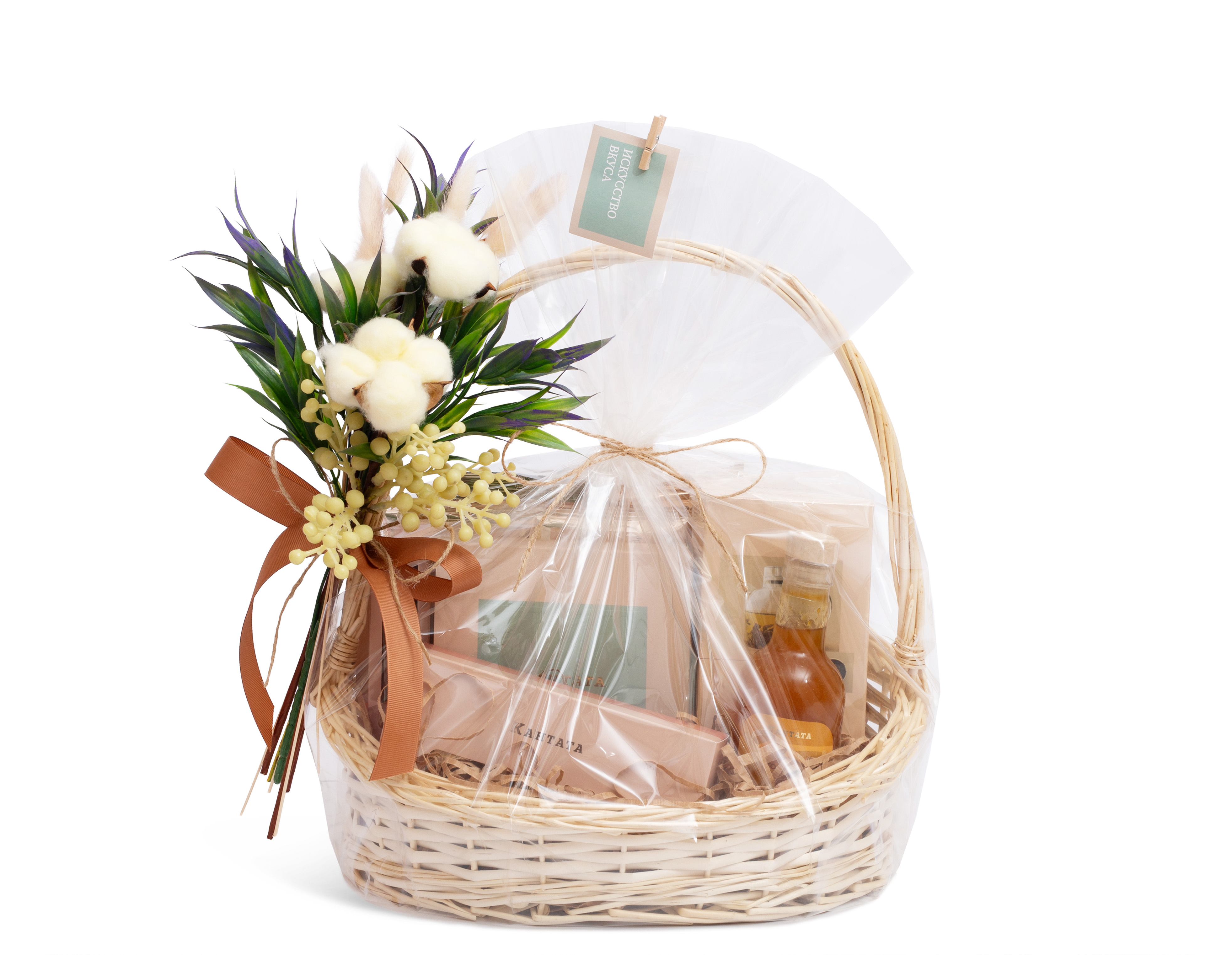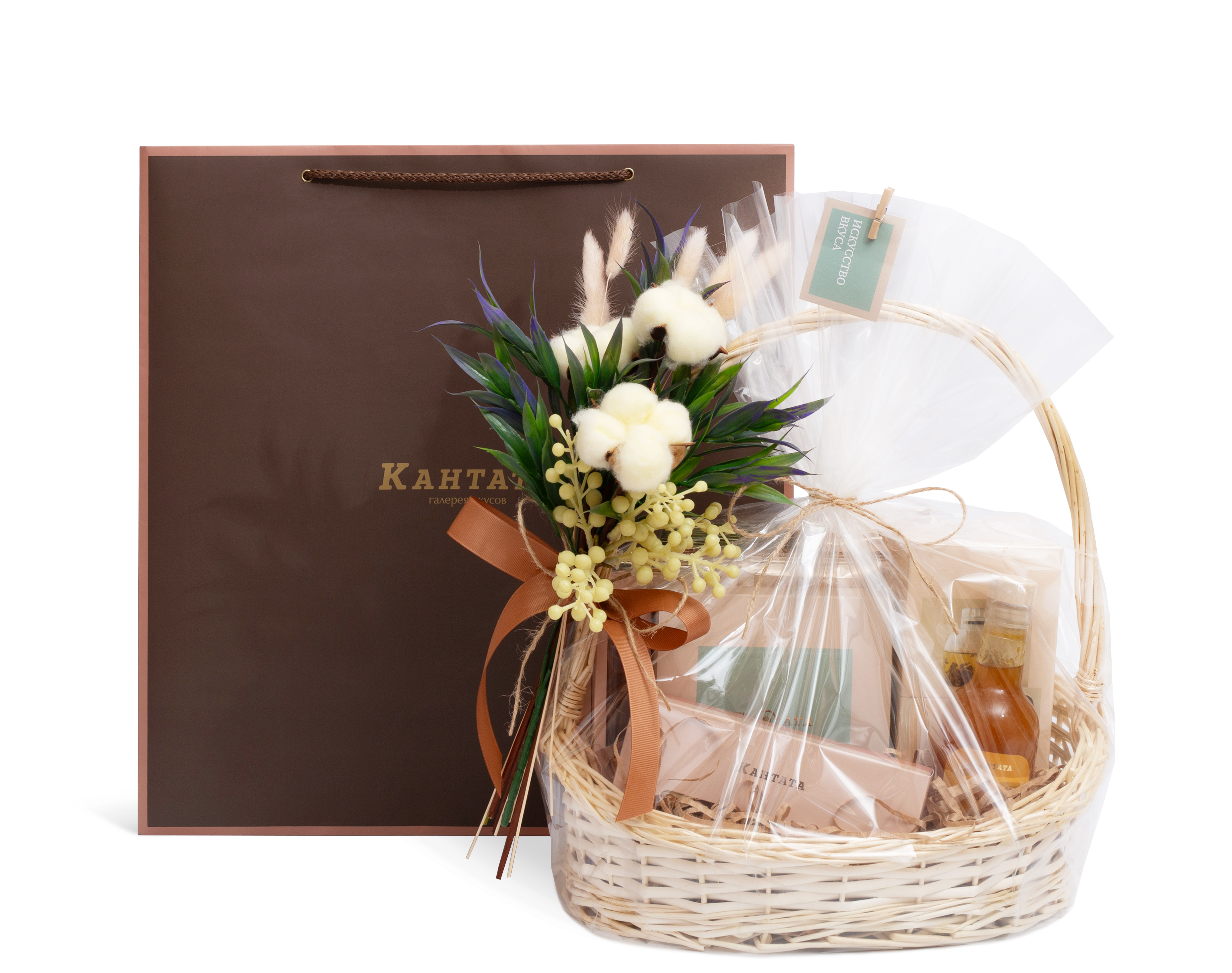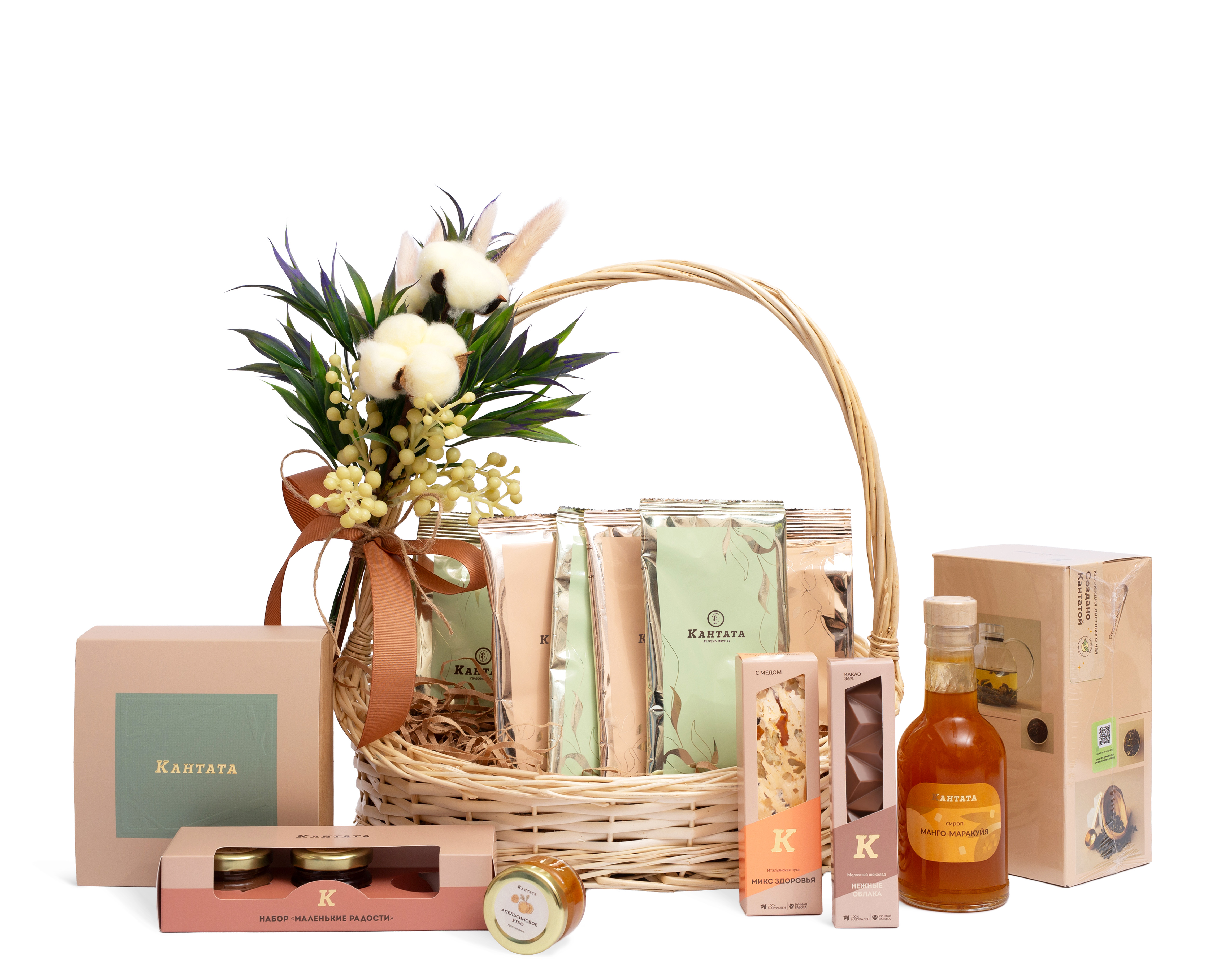 Корзина «Секреты ценителя» — это продуманный до мелочей подарок для тех, кто умеет ценить атмосферу. Внутри — коллекция вкусов и ароматов: фруктовый сироп, авторские чайные бленды и десерты с натуральным составом. Тёплые оттенки, хлопок и джут в оформлении подчёркивают идею уюта, а высокие борта корзины делают подачу особенно элегантной. Такой подарок воспринимается как знак искренней заботы — ненавязчивой, но глубокой.