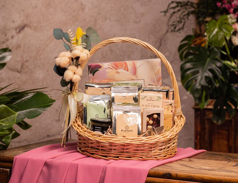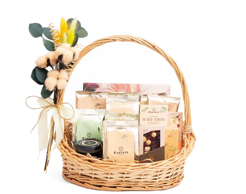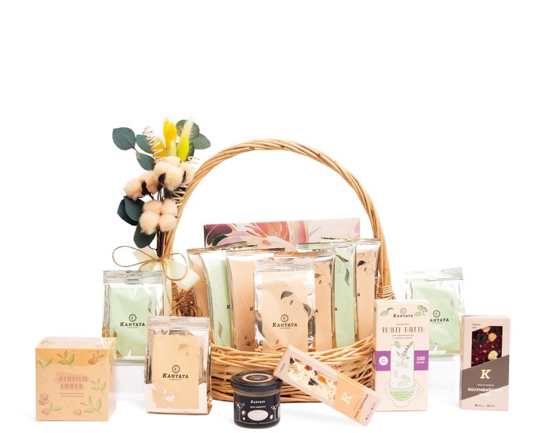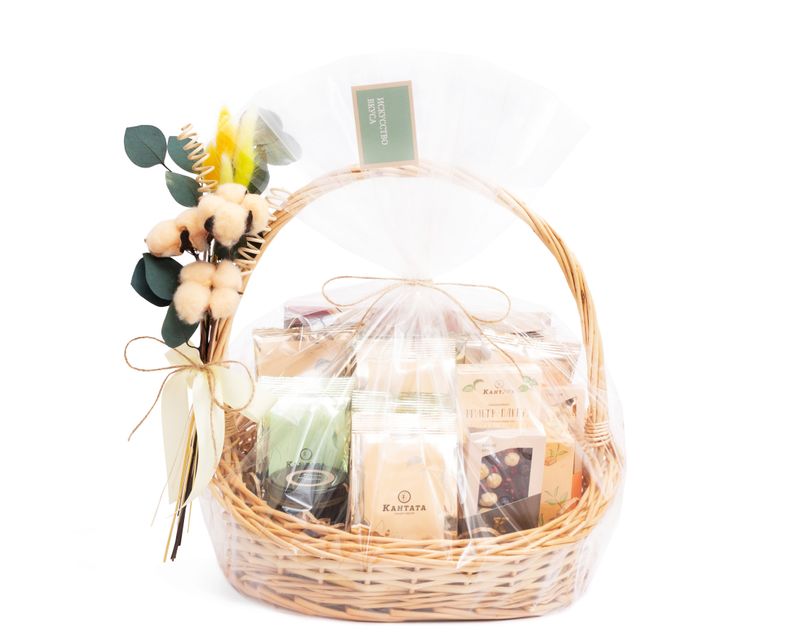 Уникальная корзина, полная ярких сюрпризов! Внутри — коллекция ароматного чая одиннадцати сортов, аппетитные десерты ручной работы и аксессуары, чтобы чаепития всегда проходили с комфортом.