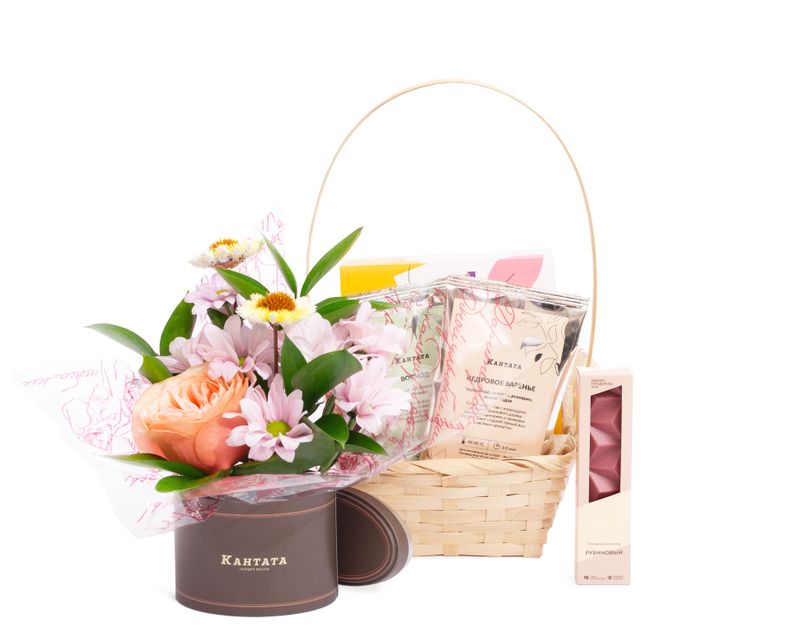 Воздушная композиция из розы, хризантемы и листочков рускуса собрана в изящной деревянной корзине и дополнена согревающим черным чаем «Кедровое варенье», зеленым чаем «Восход» с ягодками земляники и плиткой редкого рубинового шоколада. Чтобы любимый напиток надолго сохранил свои вкус и аромат, в подарок мы вложили стильную баночку для хранения.