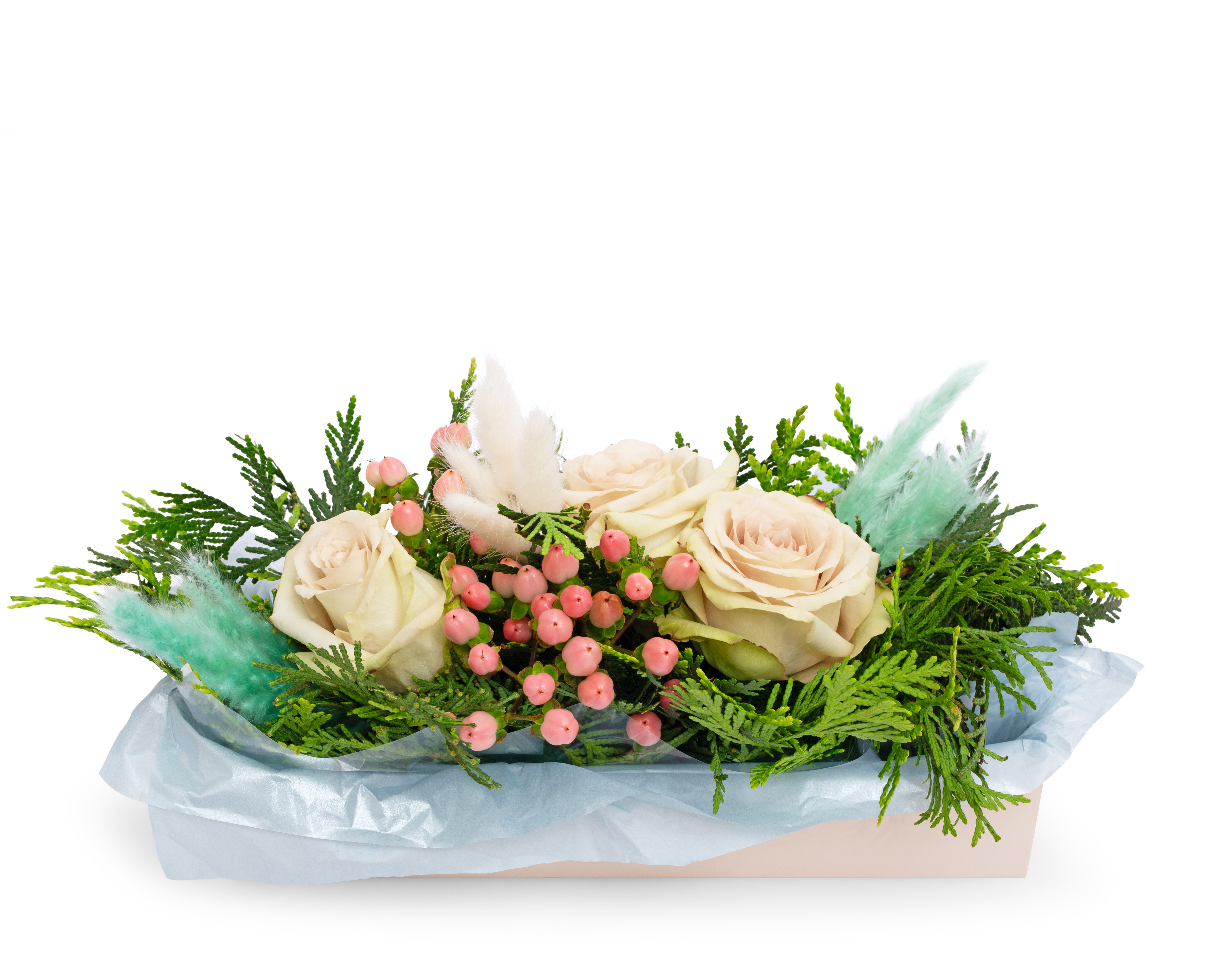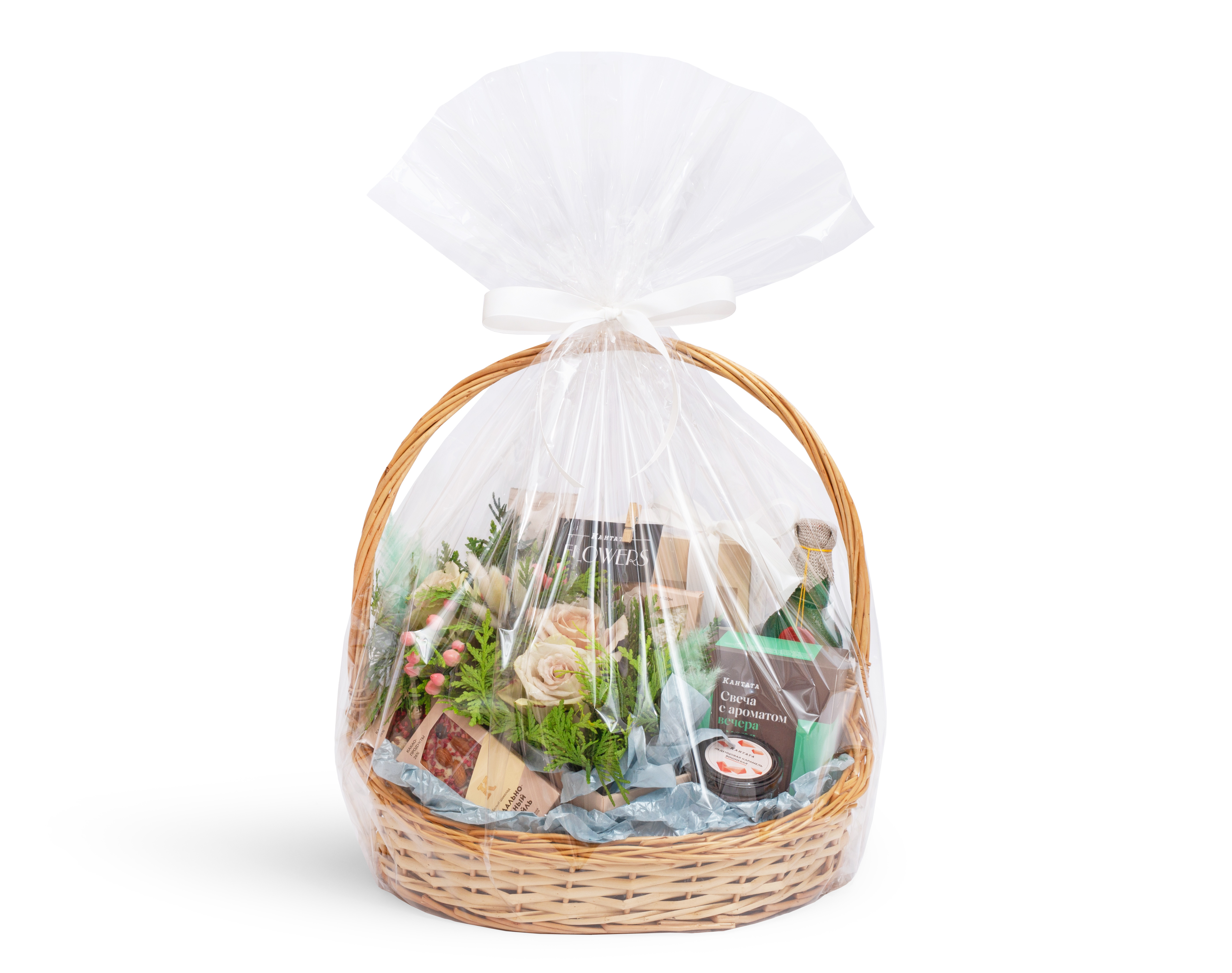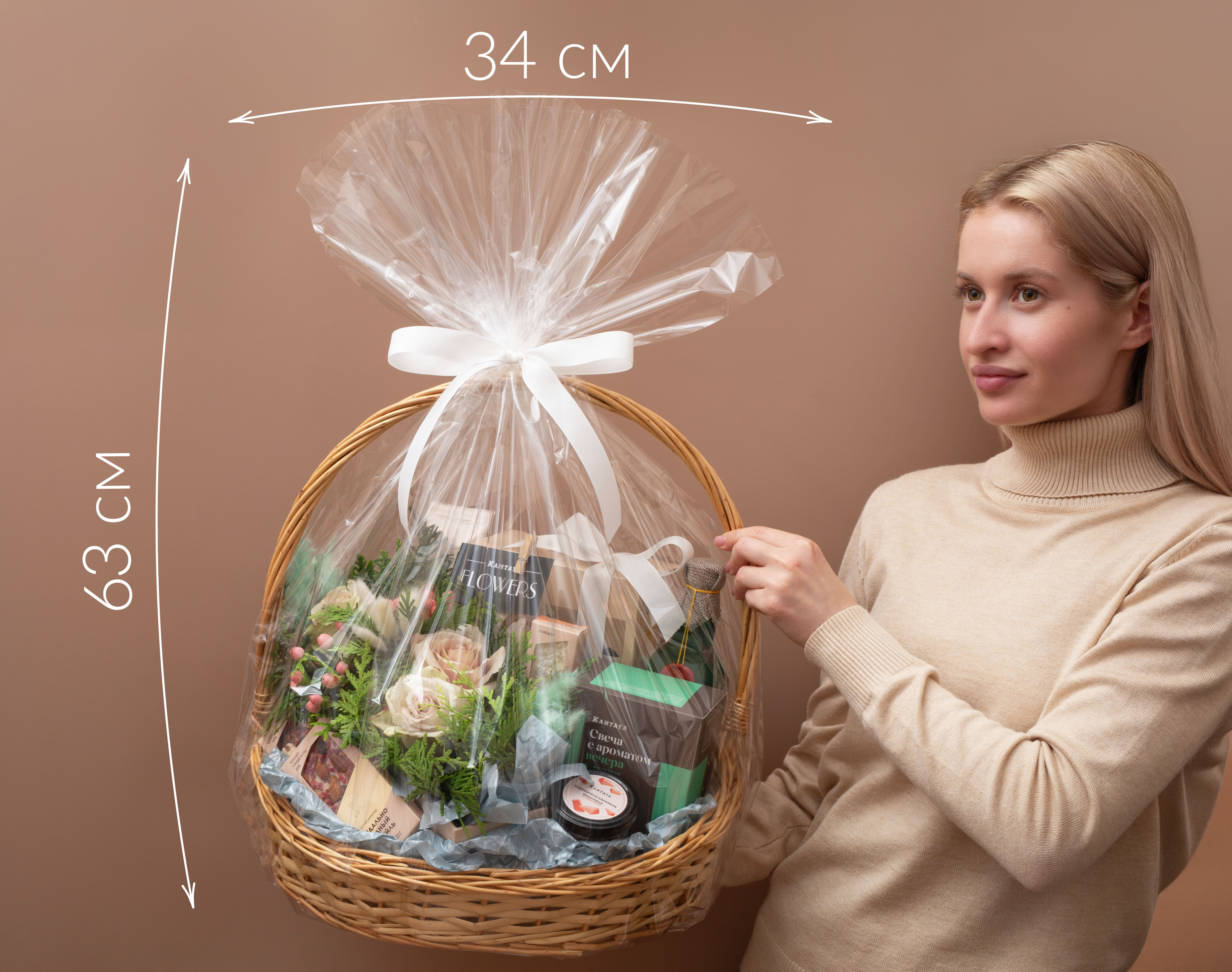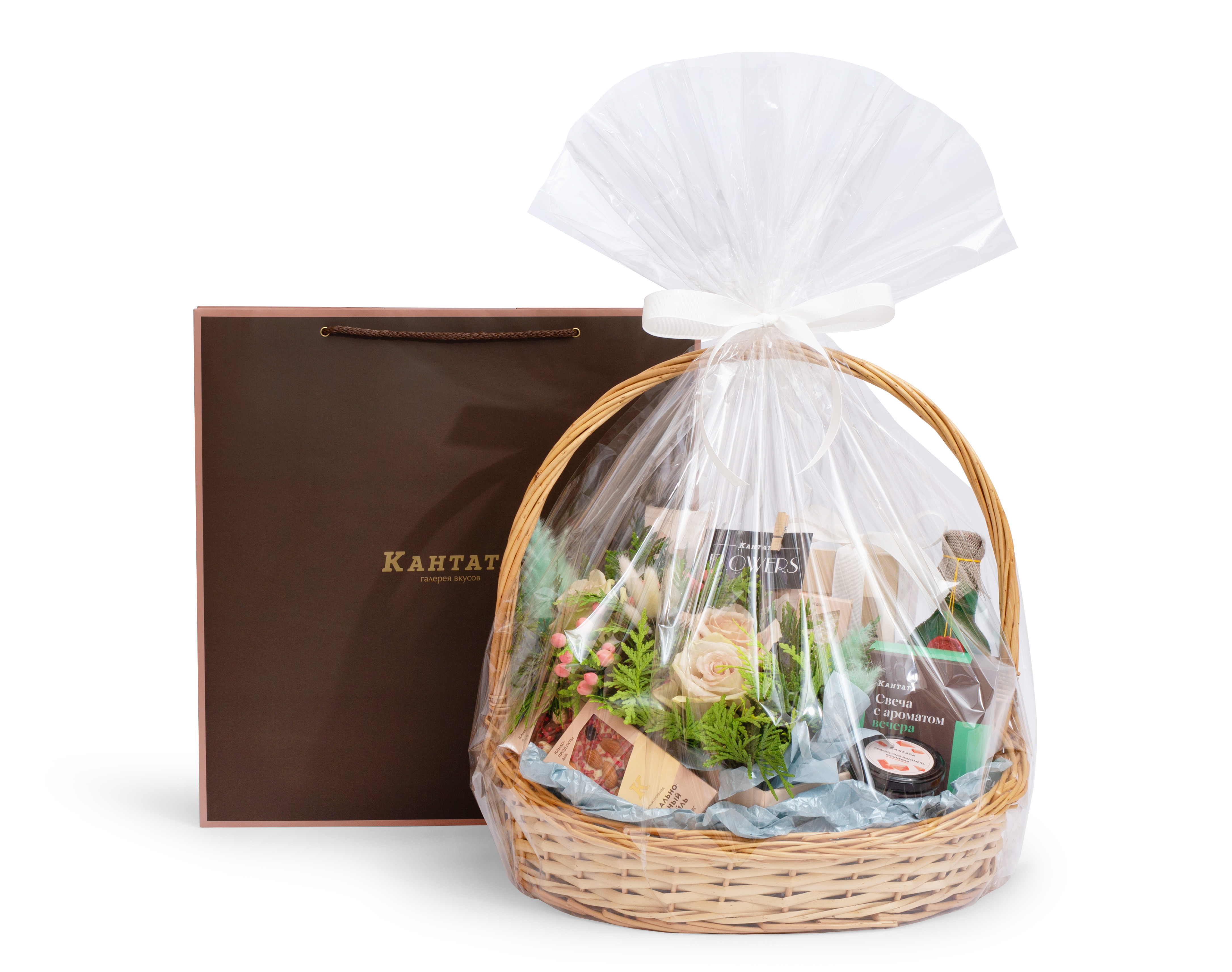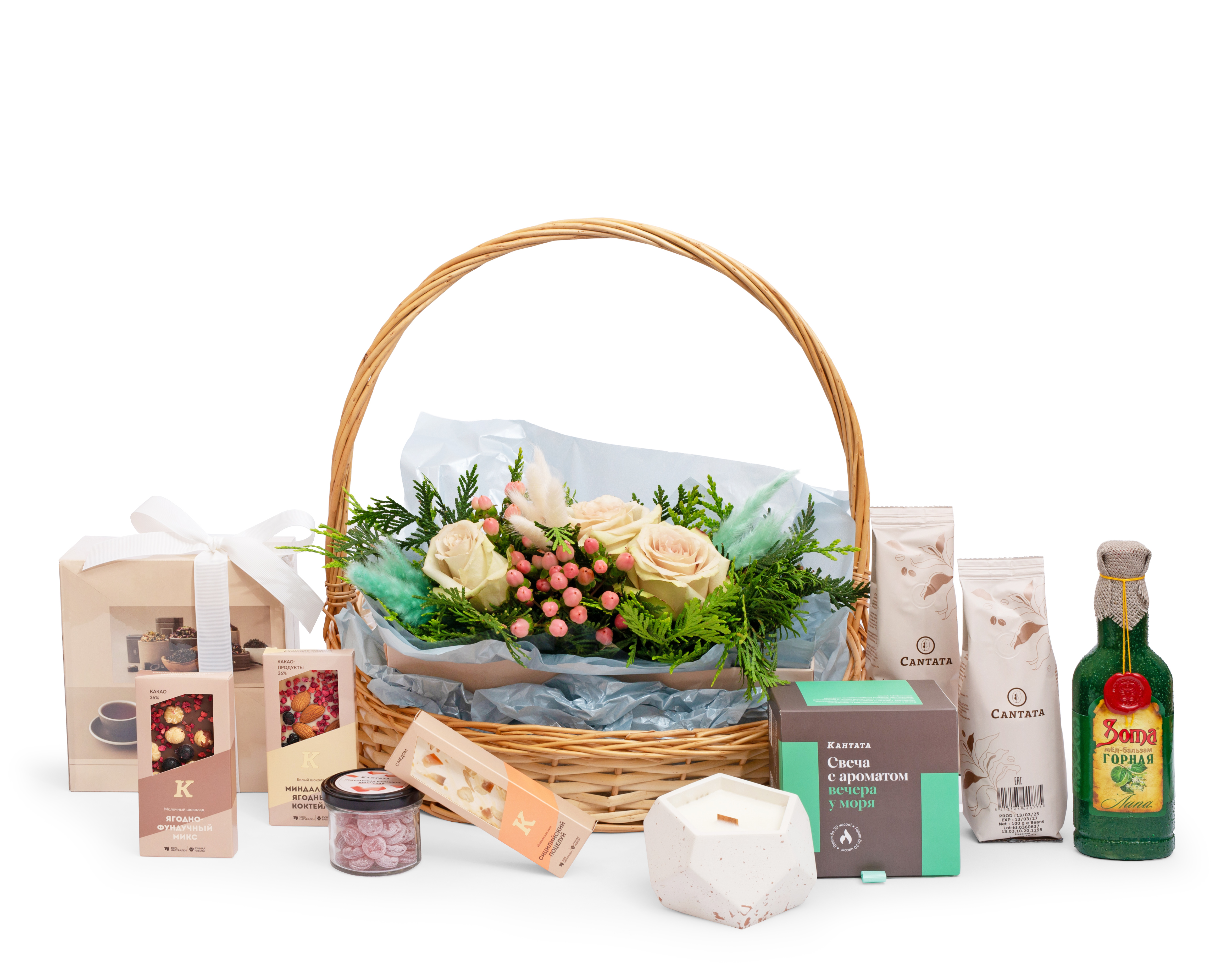 Роскошная корзина с высоким бортом, наполненная сочетанием ароматов, вкусов и красоты. Внутри — лучшие десерты и напитки сезона: шоколад, нуга, кофейные купажи и ароматная свеча, создающая атмосферу зимнего уюта.
