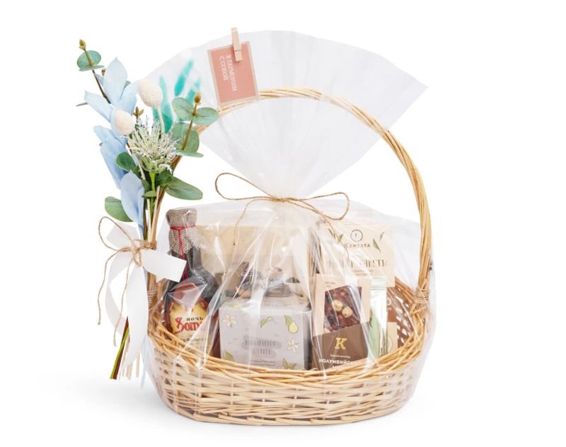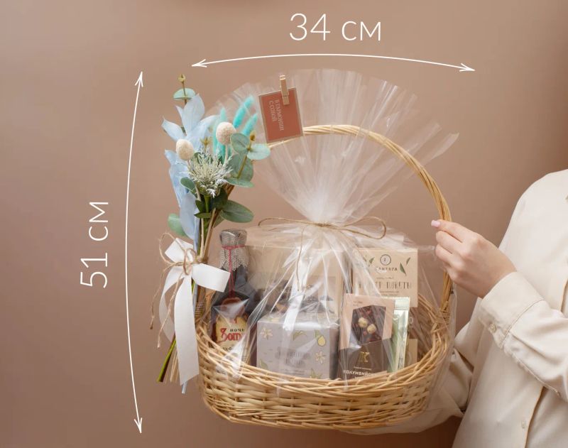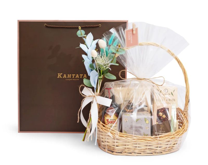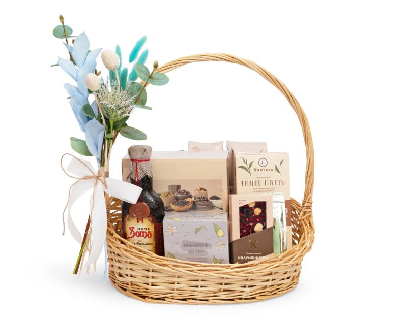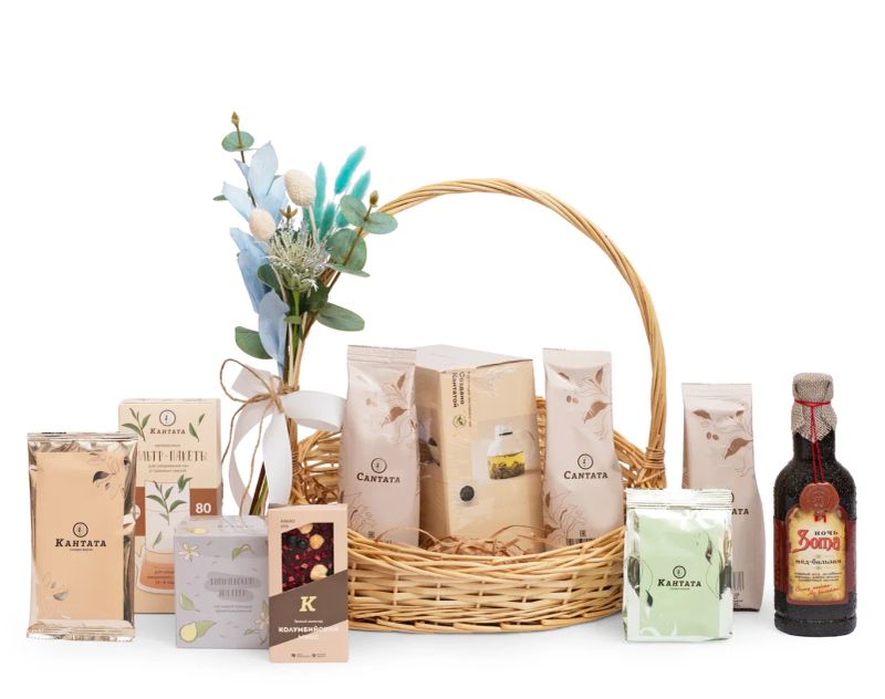 В основе — богатая коллекция черных и зеленых чаев с пряными, фруктовыми и цветочными оттенками, которые раскрываются постепенно и многослойно. Кофе с плотным и выразительным характером добавляет композиции силы и баланса, а десерты усиливают гастрономическое впечатление. Флористическое оформление с эвкалиптом, эрингиумом и легкими природными акцентами делает корзину эффектной и по-настоящему статусной.