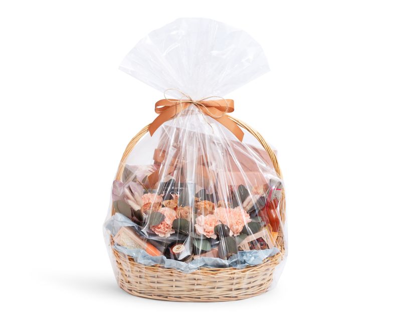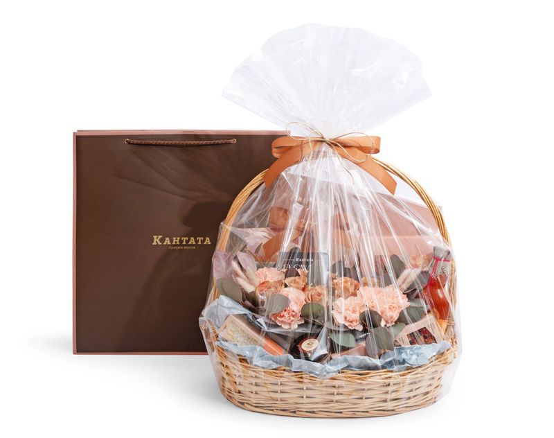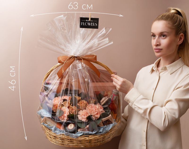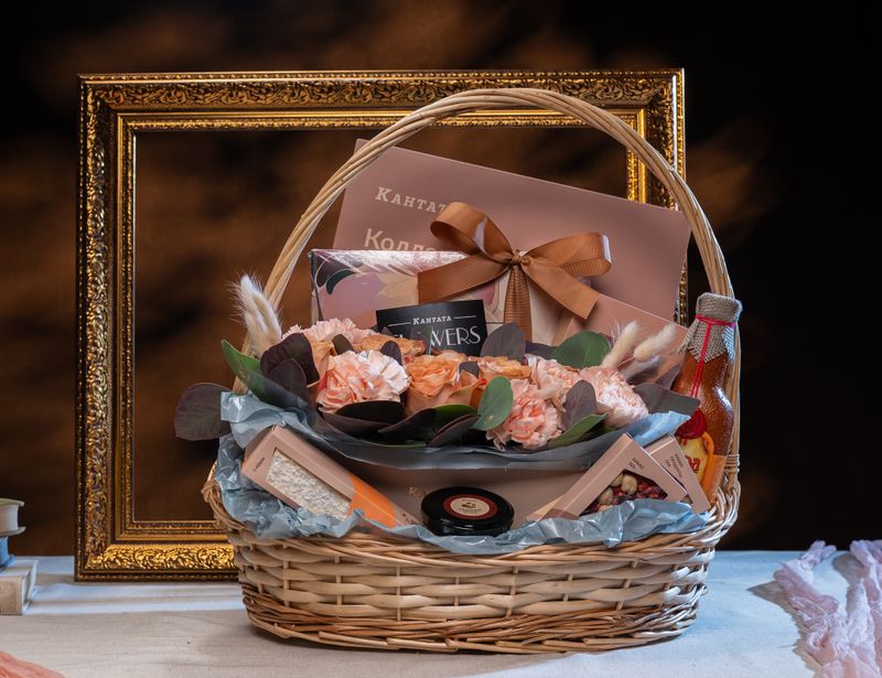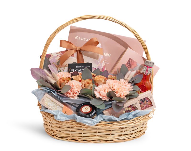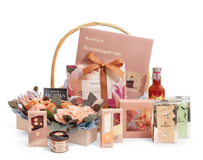 Большая, насыщенная, уютная — эта корзина словно вечерний чай в саду. Живые цветы встречают ароматами с первых минут. Внутри: роскошный чайный сет из 12 сортов, медовоый сироп, шоколад с орехами и ягодами, крем-карамель и настоящие «Сладкие мелодии». Здесь тепло и забота в каждом предмете.