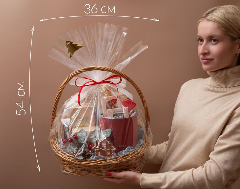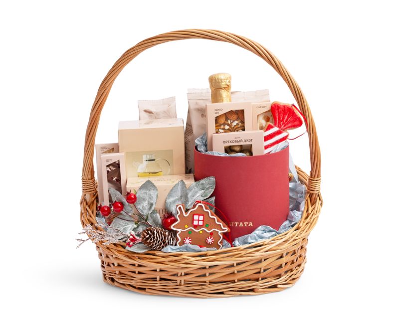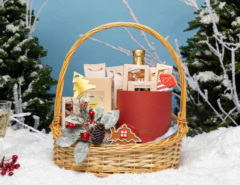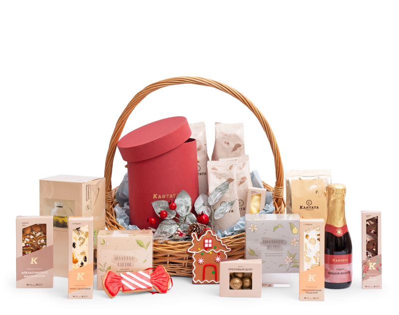 Большая корзина, наполненная всем, что создает ощущение уюта и тепла. В ней собраны кофе, чай и десерты — вкусы Кантаты, которые идеально сочетаются между собой. Сироп «Вишня-ваниль» добавляет нотку праздника, а нуга, драже, шоколад и новогодние украшения делают подарок по-настоящему атмосферным. Это корзина для тех, кто ценит вкус, уют и заботу, воплощенные в каждом ингредиенте.