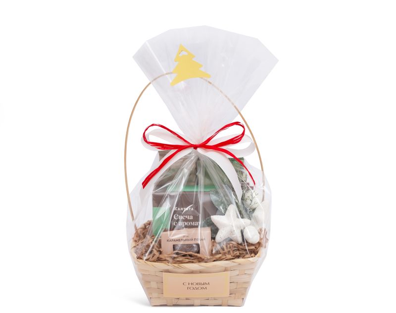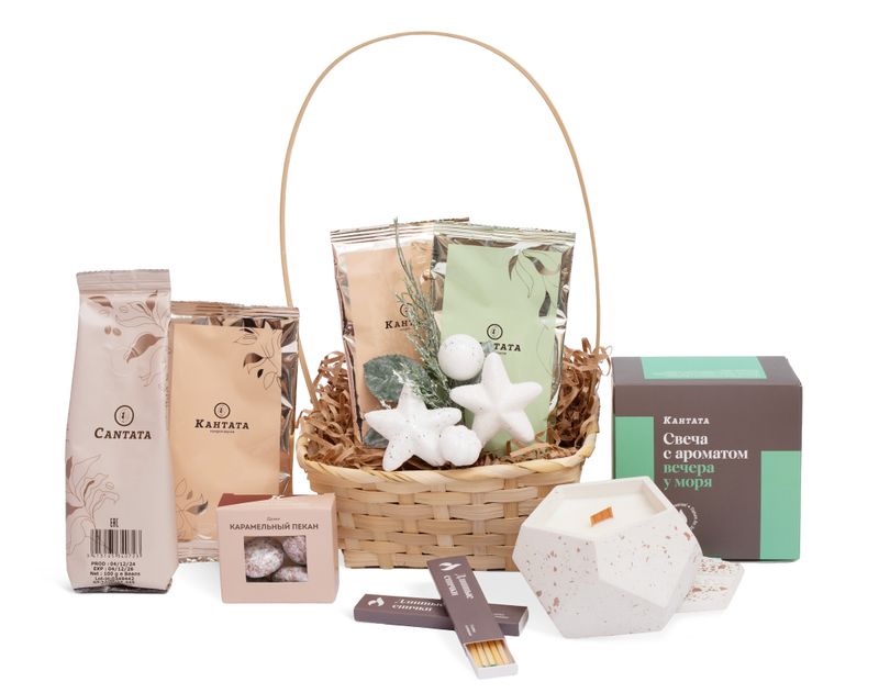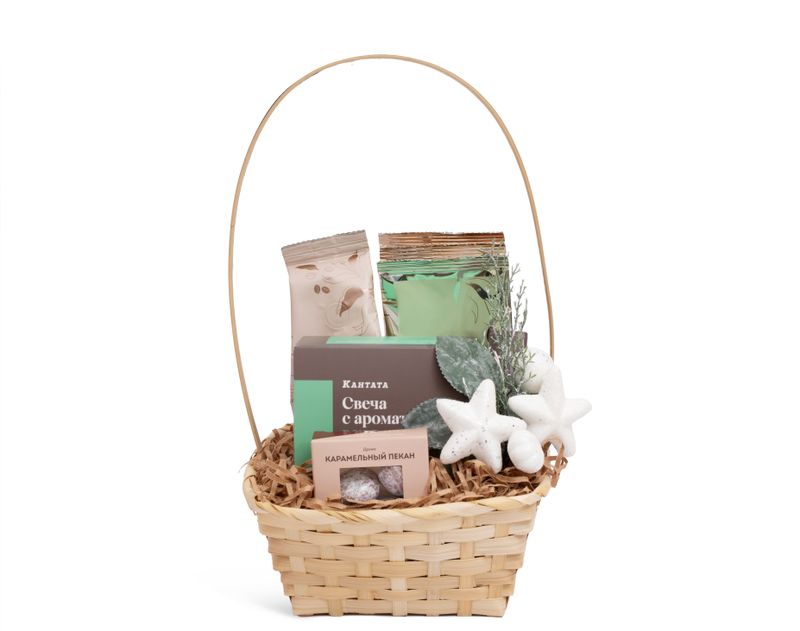 Тёплый, душевный подарок для дома. В плетёной корзине — свеча с ароматом моря, чай и кофе, сладости и декоративная веточка, создающая зимнее настроение. Всё продумано до мелочей, чтобы согреть атмосферу и подарить ощущение спокойствия, словно вы сидите у камина с чашкой любимого напитка.