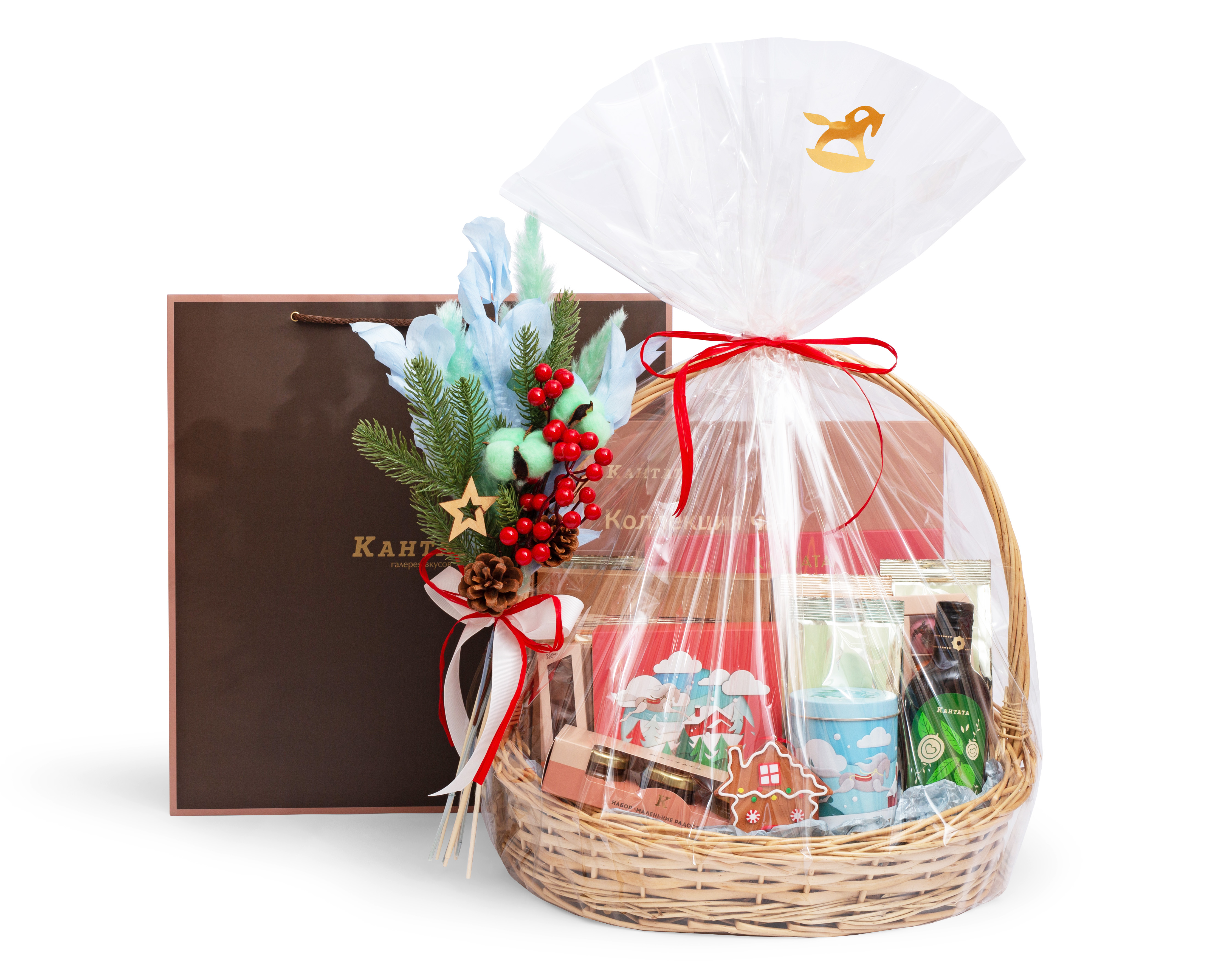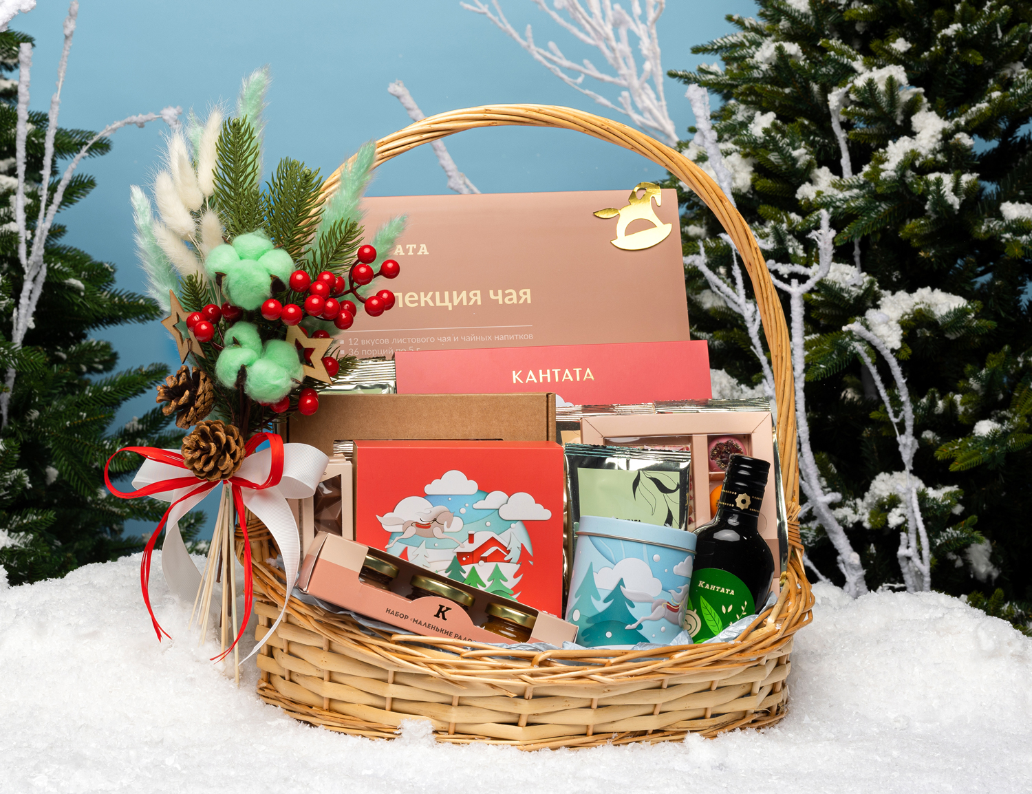 Эта корзина собрана из самых теплых мгновений зимы. В ней — ароматные чаи, шоколад, десерты и сироп, которые приглашают сделать паузу и насладиться уютом. Каждый элемент продуман до мелочей: от нежных сладостей до изящного декора с голубым рускусом и яркими ягодами. Подарок, который создаёт настроение неспешного зимнего вечера, наполненного светом, вкусом и заботой.