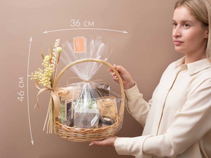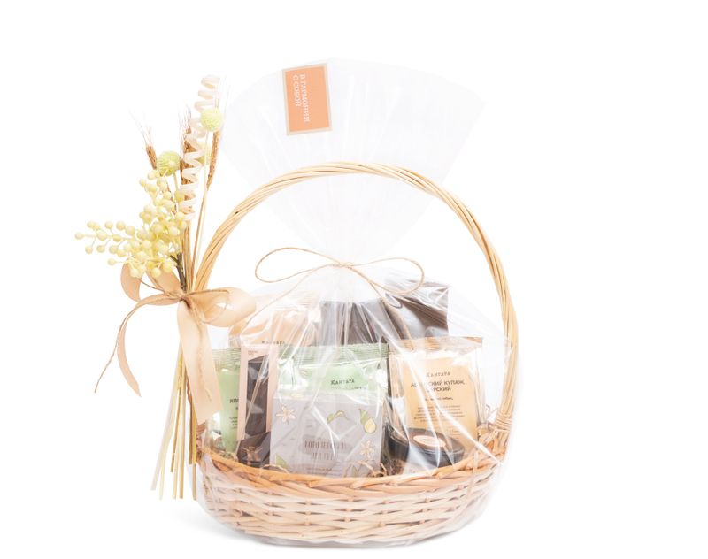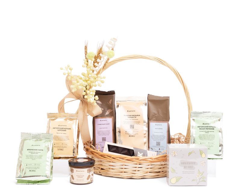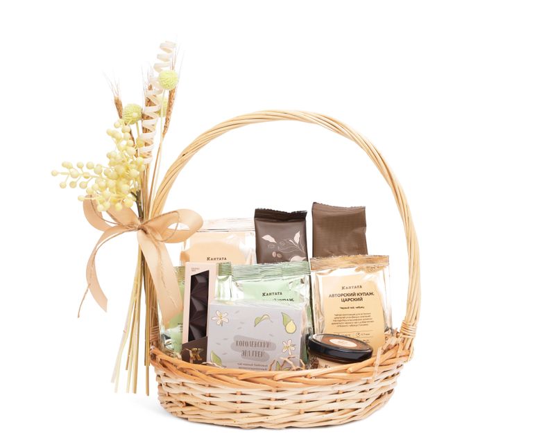 Корзина, полная великолепных вкусов! Внутри — пять сортов чая, среди которых найдутся как классические сорта, так и душистые купажи под любое настроение, а также два сорта кофе — также классический и десертный. Крем-карамель с отборными орехами и плитка темного шоколада своим контрастом вкусно дополнят грани согревающих напитков.