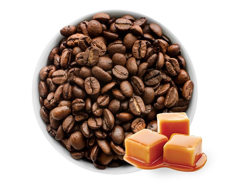 В основе кофе Карамель лежит искусно сбалансированный бленд бразильской и колумбийской арабики. Сразу после обжарки кофейные зерна тщательно смешиваются с жидким, высококачественным ароматизатором во вращающемся барабане. В результате, ароматизатор естественным образом проникает в зерна, раскрывая свои потрясающие свойства, поскольку после обжарки поры кофейных зерен остаются открытыми.