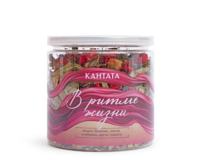 Купаж «В ритме жизни» — настоящий шедевр без добавления чая, созданный из ягод и листьев вишни, красного базилика, лимона, клубники и цветов граната. Он напоминает яркую мозаику вкусов и ароматов, где каждая деталь играет свою роль.