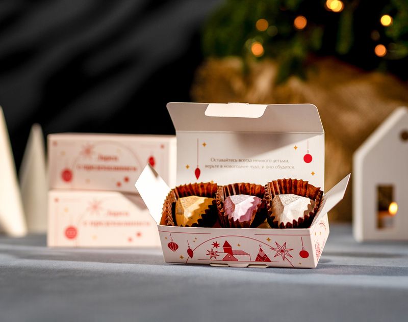 Удивительный набор подарит впечатление не только ярким вкусом трех десертов, но и неожиданным светлым предсказанием на грядущий год внутри пестрой коробочки.