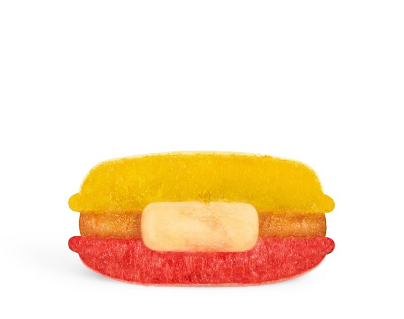 Состав: сахар, миндальная мука, пюре ананас, белок яичный, шоколад белый, 28%, пюре кокос, вода, игристое вино брют розовое, 11%, глюкоза сироп, пектин, краситель пищевой (e110, e124), каррагинан, кислота лимонная, камедь рожкового дерева, цитрат натрия.
