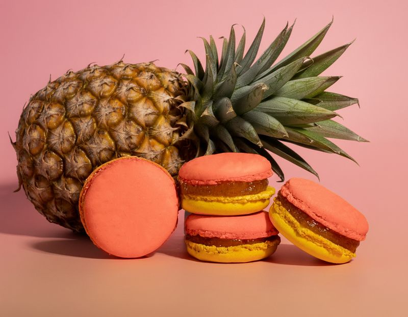 Ананасы в шампанском – это пульс вечеров! А ещё это яркий джем, обрамляющий бархатистый ганаш из белого шоколада и кокосового пюре. Несмотря на розовое игристое вино в составе десерта, это пирожное можно даже детям.