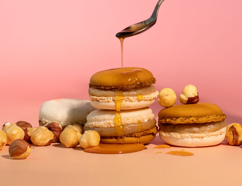Состав: сахар, миндальная мука, белок яичный, молоко, 3,5%, сливки, 35% (нормализованные сливки, стабилизатор каррагинан), масло сливочное, 82,5%, вода, мука пшеничная, кленовый сироп, грецкий орех, краситель пищевой (e110, e102, e122, e133), камедь ксантановая, камедь рожкового дерева.