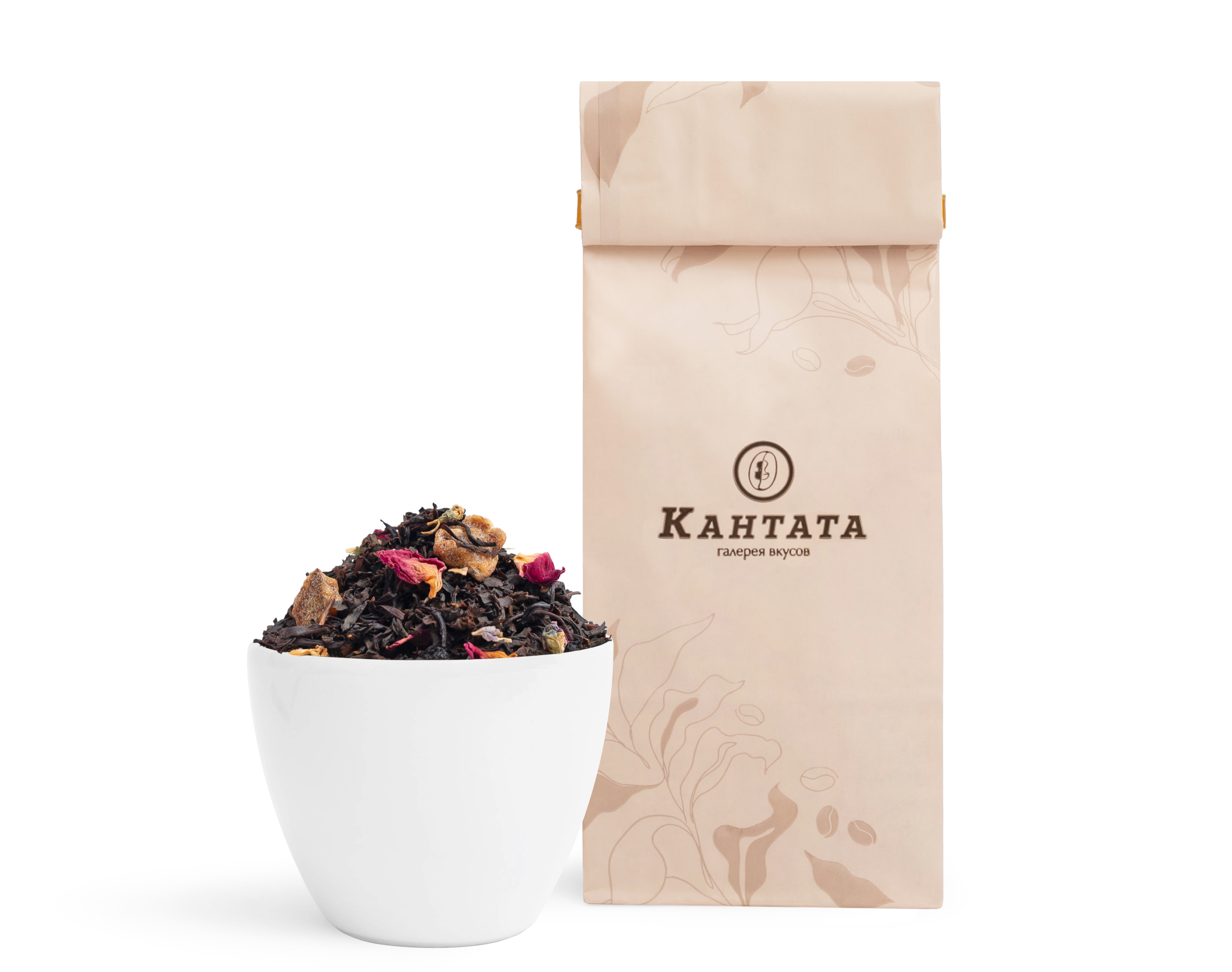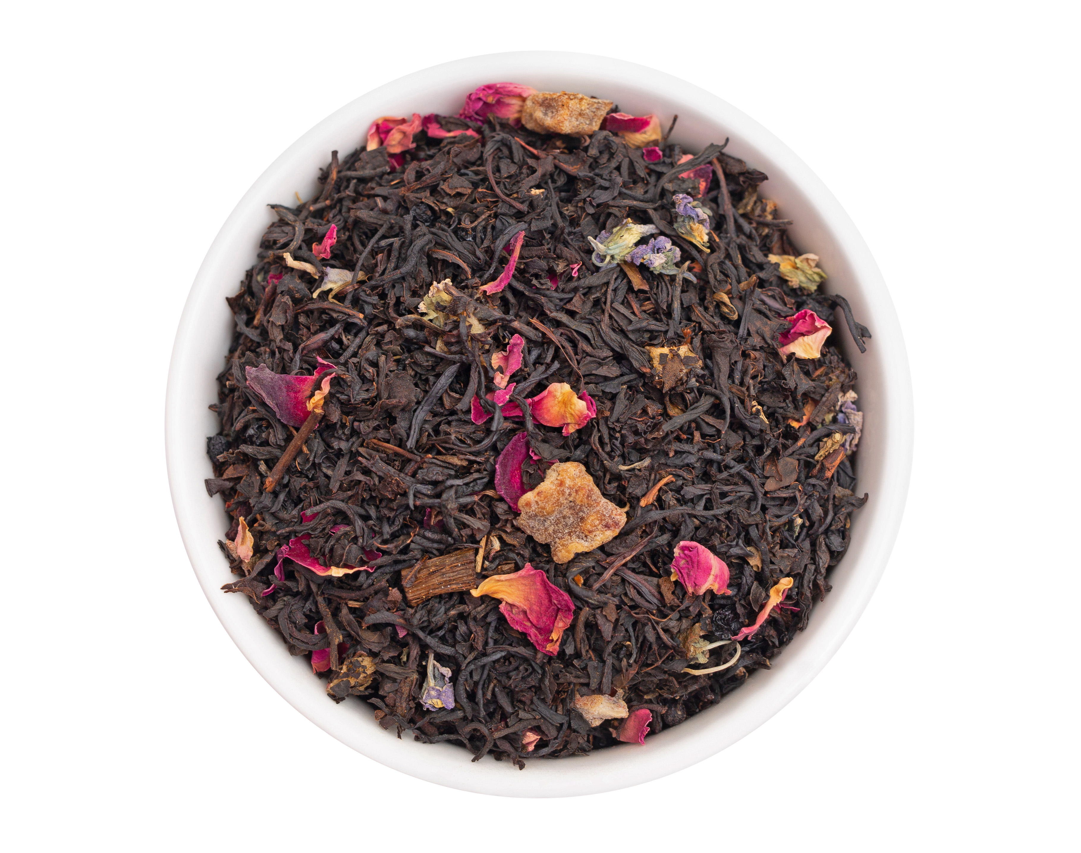 Состав: чёрный чай, бузина, кусочки финика, ароматизатор, малина, лепестки розы, ваниль, фиалка, кусочки личи.