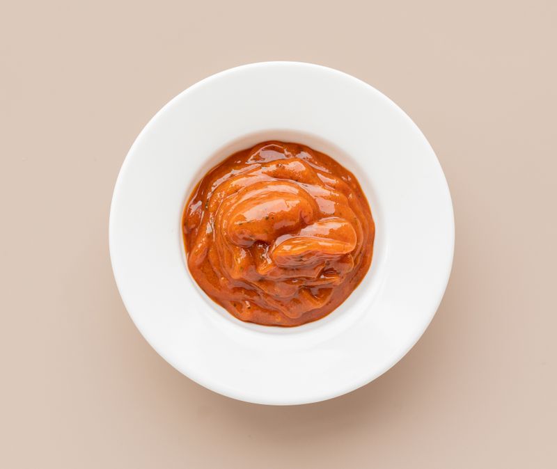 Состав: рапсовое масло, томатная пудра,глюкозный сироп, соль, луковая пудра, чеснок, бульонный порошок (соль, гидролизованный белок рапса, картофельный крахмал, сахар, ароматизатор, мальтодекстрин, травы, специи), петрушка, перец, сладкий болгарский перец (2%), натуральный ароматизатор сладкого перца, натуральный ароматизатор розмарина, куркумы, тмина, кайенского перца, антислеживатель: диоксид кремния.