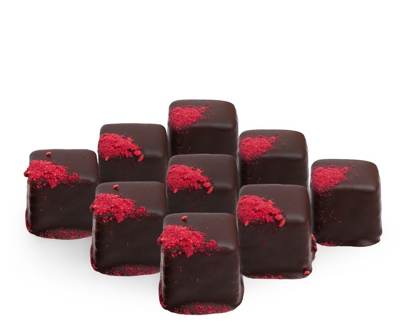 Нежное маршмеллоу, заключенное в оболочку из темного шоколада, поражает своим ярким малиновым вкусом, прекрасно сочетающимся с природными ягодными нотами темного шоколада.