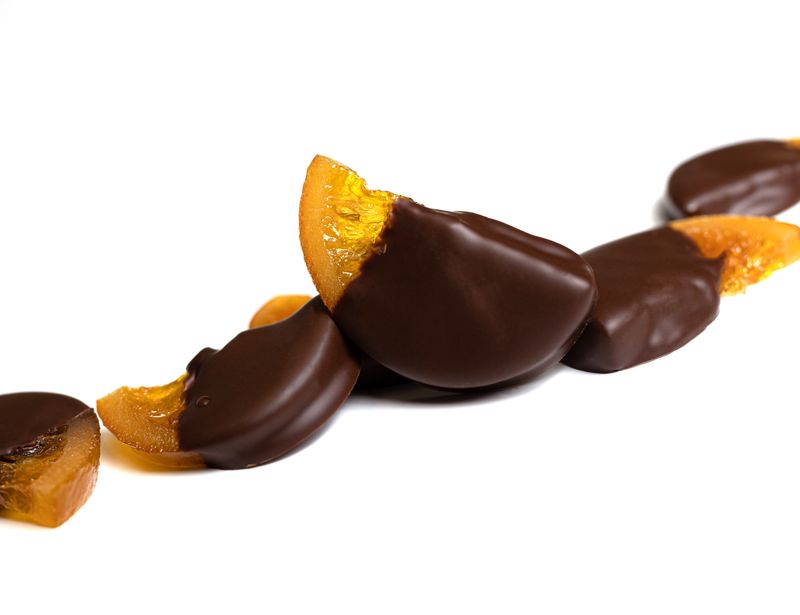 Каждая сочная апельсиновая долька покрыта на две трети густым слоем темного шоколада, в котором содержание какао-продуктов достигает 60%. Благодаря содержащемуся кофеину, горький шоколад поможет взбодриться, стимулируя умственную и физическую деятельность.