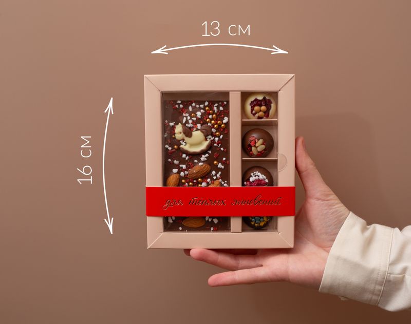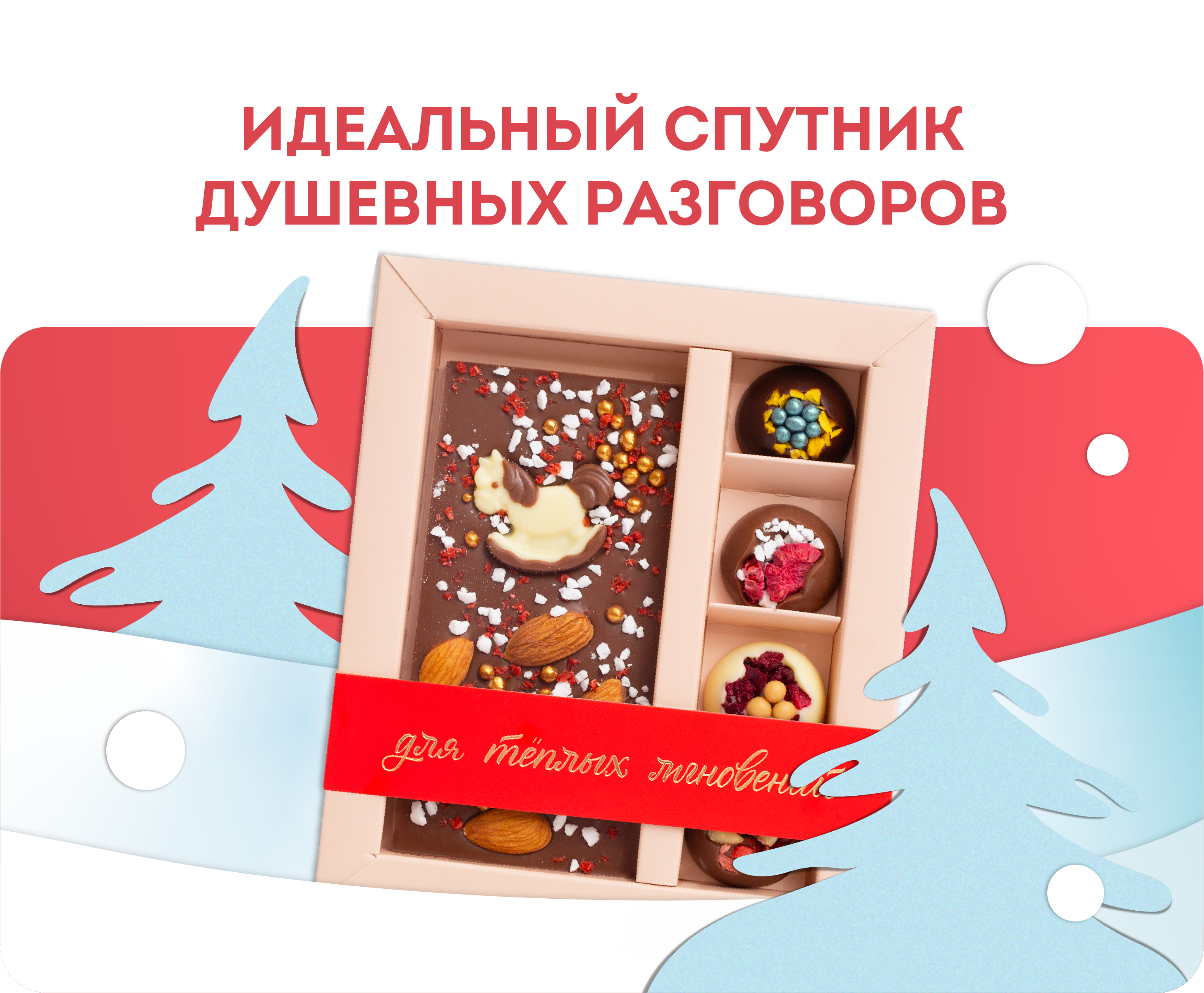 Название набора точно передает атмосферу зимних праздников — времени уюта, радости и сладких мгновений рядом с близкими. Основа плитки приготовлена из нежного молочного шоколада. Центральный акцент — фигурка лошадки из белого и молочного шоколада, выполненная вручную кондитерами. Вкус и настроение дополняет посыпка из цельного миндаля, кранча клубники, меренги и хрустящих шариков криспи.