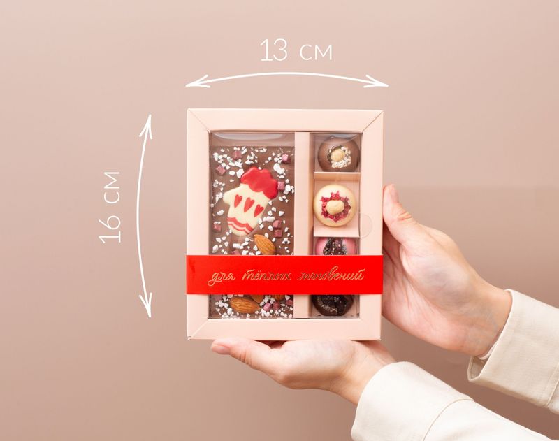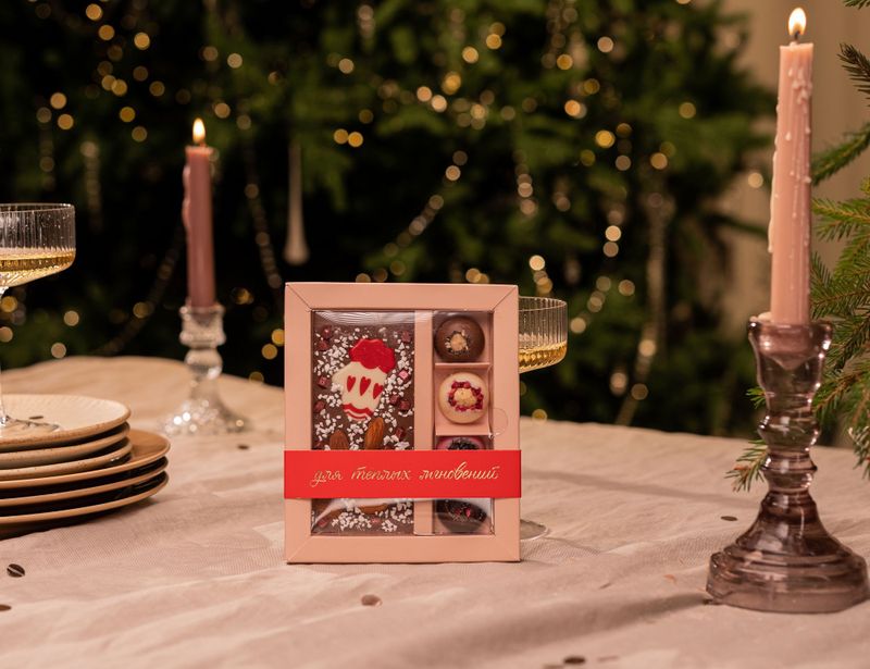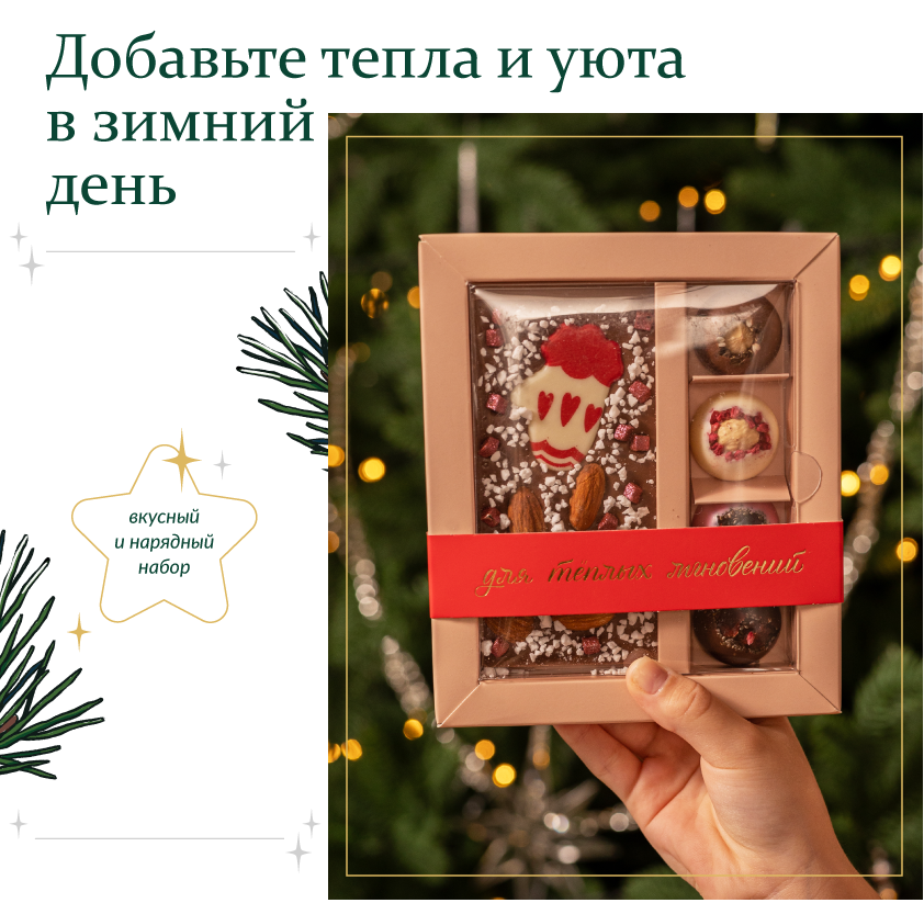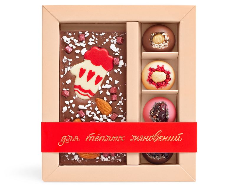 В набор входит плитка молочного шоколада, украшенная обязательными атрибутами холодной зимы: рукавичкой из белого шоколада, цельным миндалем, желейными кусочками со вкусом апельсина, меренгой и четырьмя конфетами в праздничном оформлении.