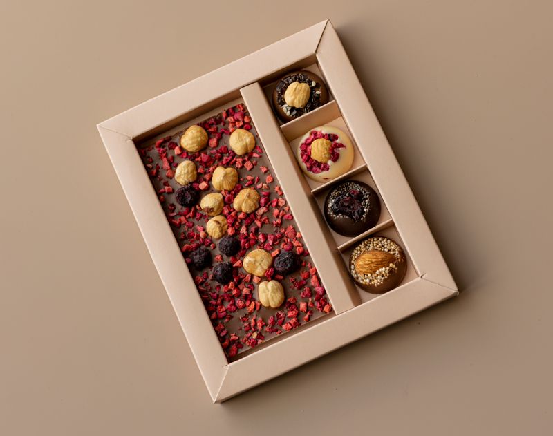Тонкая плитка шоколада «Ягодно-фундучный микс» дополнена четырьмя уникальными конфетами: