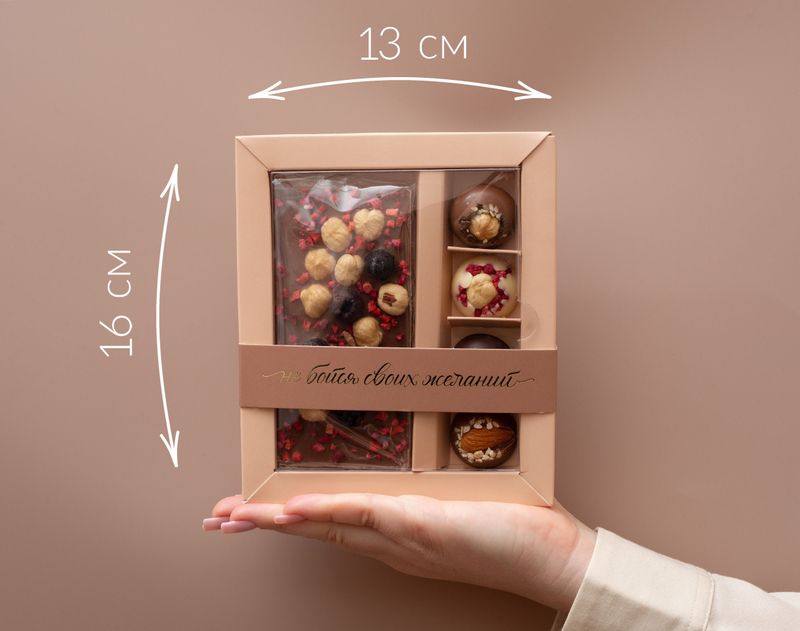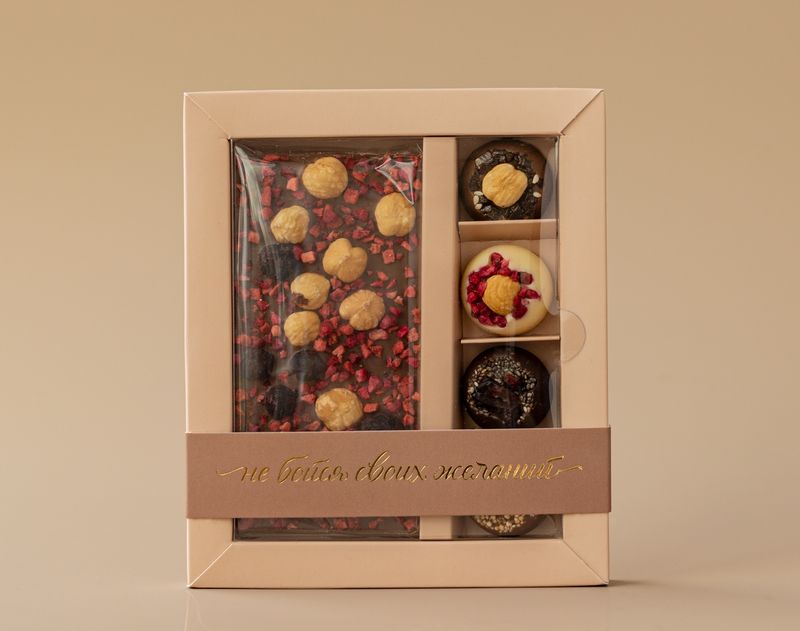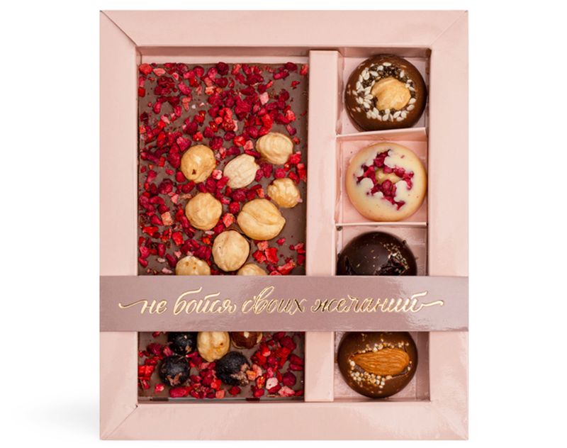 Не бойтесь своих вкусных желаний! В наборе: молочный шоколад с фундуком и ягодами, нежная сладость шоколада оттеняется свежей кислинкой ягод, и четыре конфеты в ярком оформлении с уникальными вкусами.