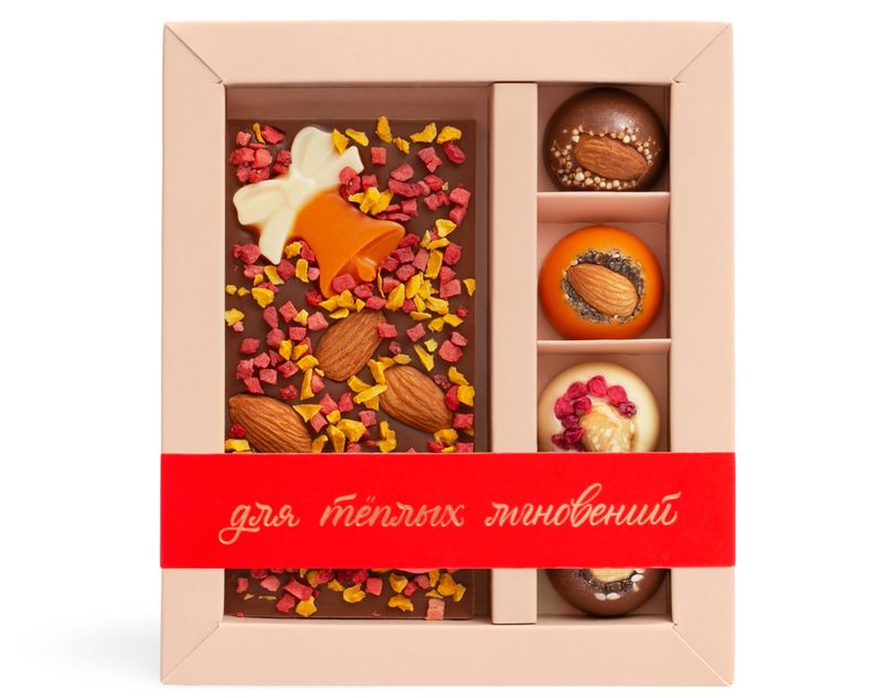 В состав этого изысканного набора входит плитка из нежного молочного шоколада, декорированная цельным жареным миндалем и кранчем клубники и маракуйи.