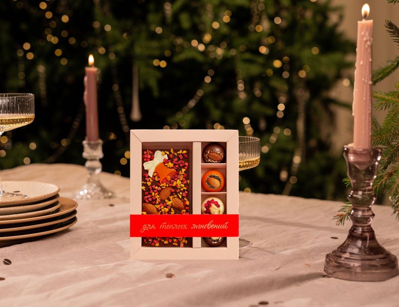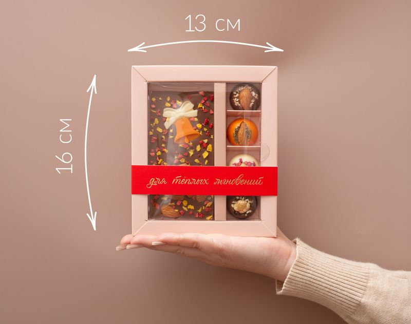 Вкусный подарок с символом новогоднего волшебства. Набор из четырех аппетитных полусфер и плитки молочного шоколада, украшенной праздничным колокольчиком и яркой посыпкой.