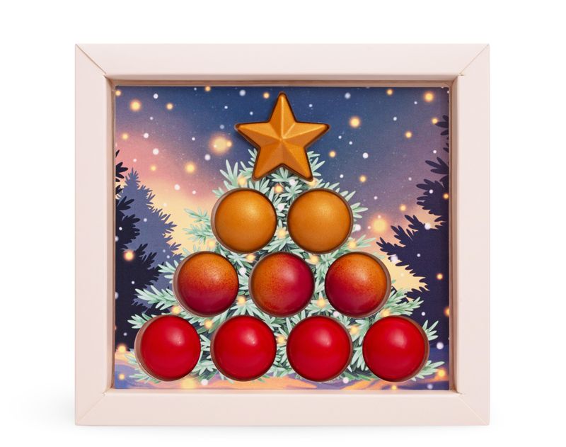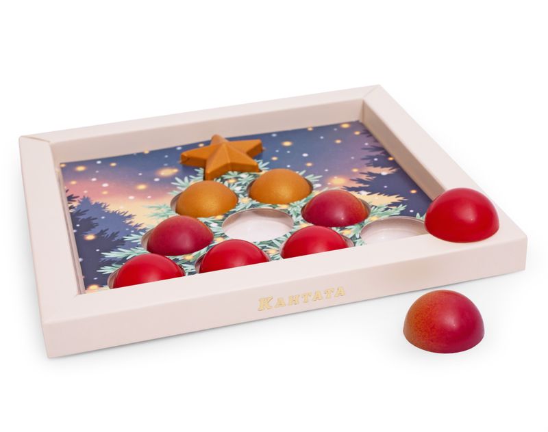 Остальные 9 конфет выполнены в форме елочных игрушек разного вкуса: