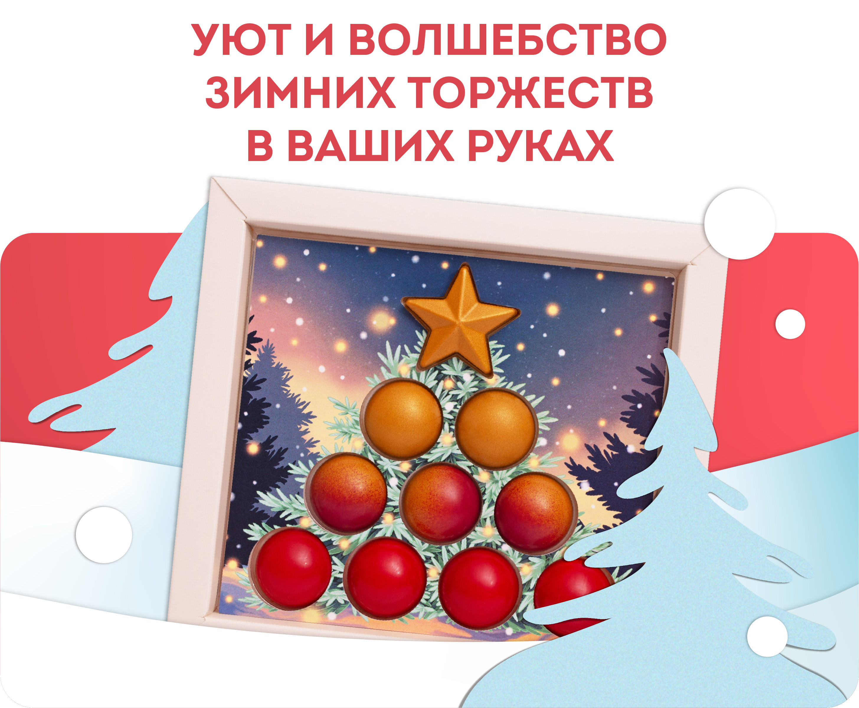 В центре внимания — сияющая конфета в форме звезды, расположенная на вершине праздничной елки. Ее корпус приготовлен из молочного шоколада и украшен золотым декором. Внутри конфеты пряная начинка на основе молочного шоколада, ореховой пасты из миндаля, вафельной крошки и специй.