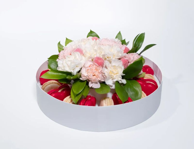 Нежные миндальные половинки с бархатной текстурой скрывают внутри сливочный крем и конфитюр с натуральной земляникой — ягодный, мягкий, с той самой лёгкой кислинкой, которая делает вкус живым и запоминающимся.